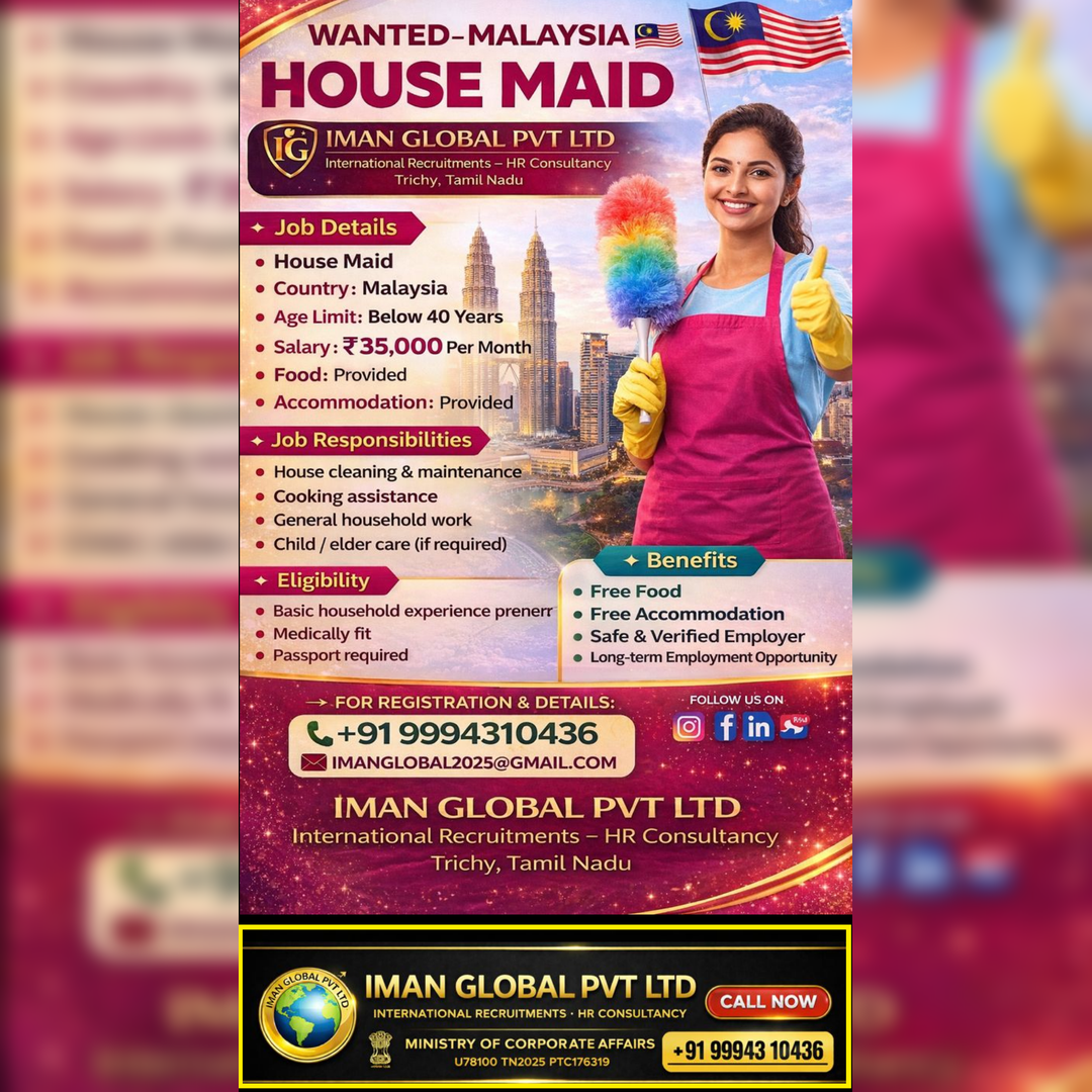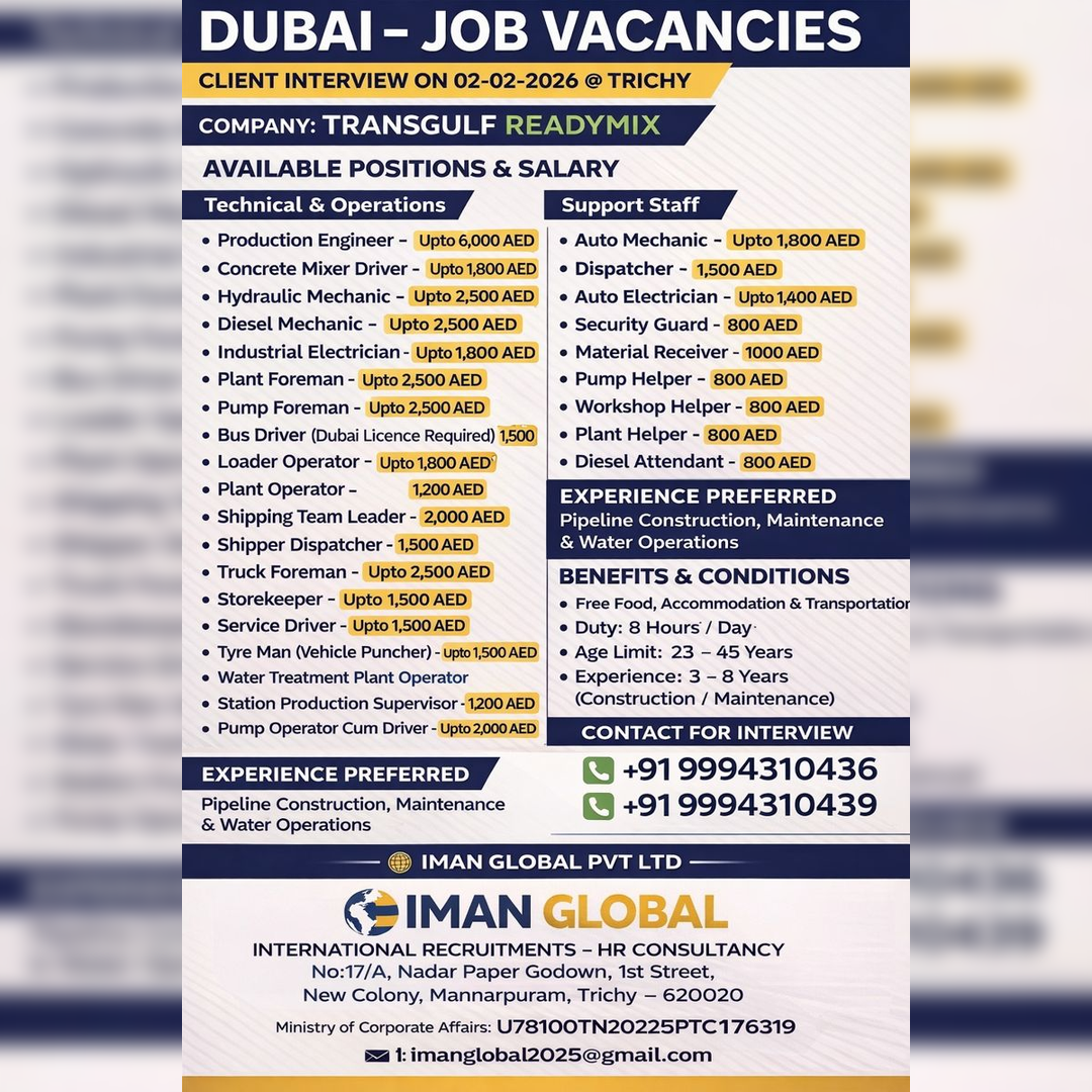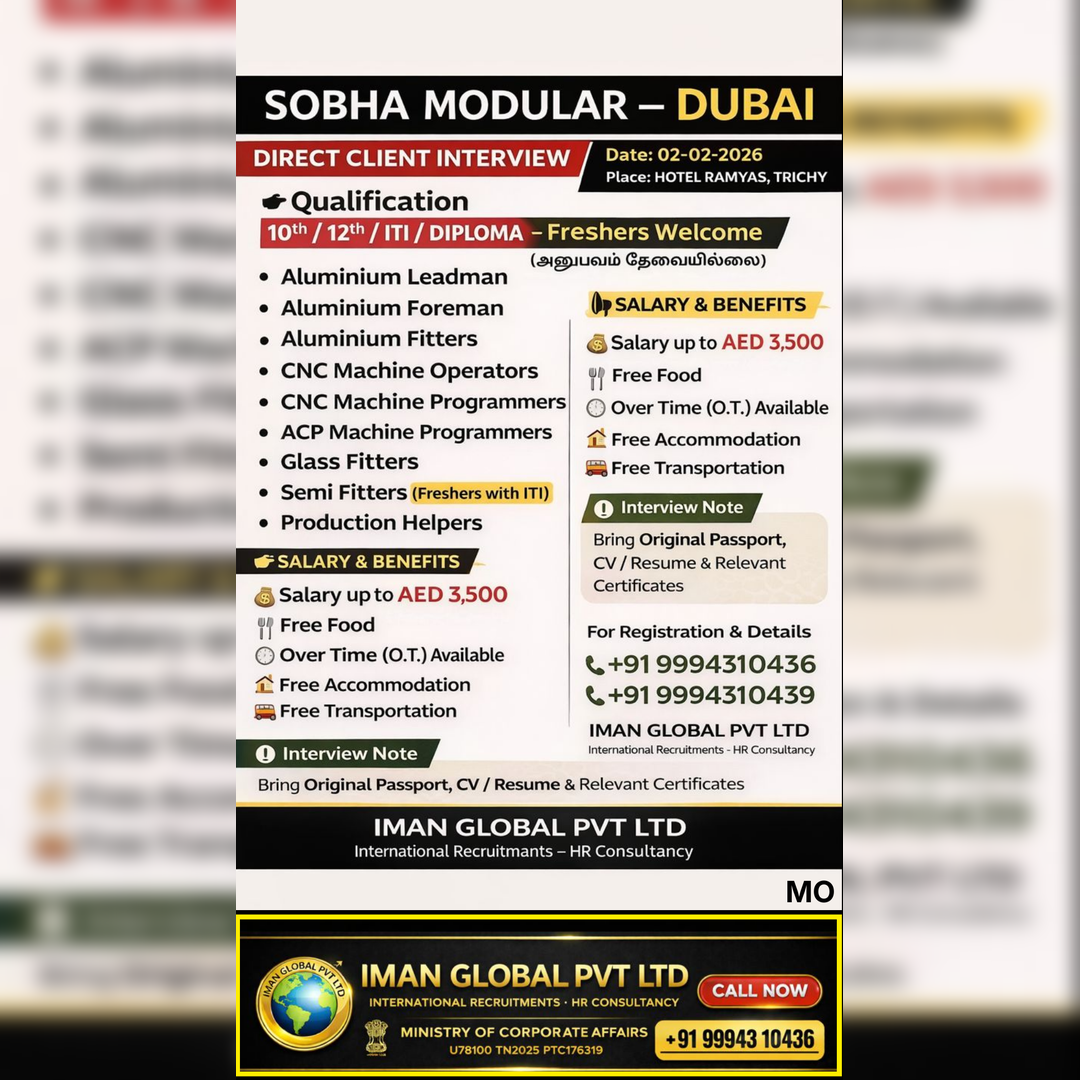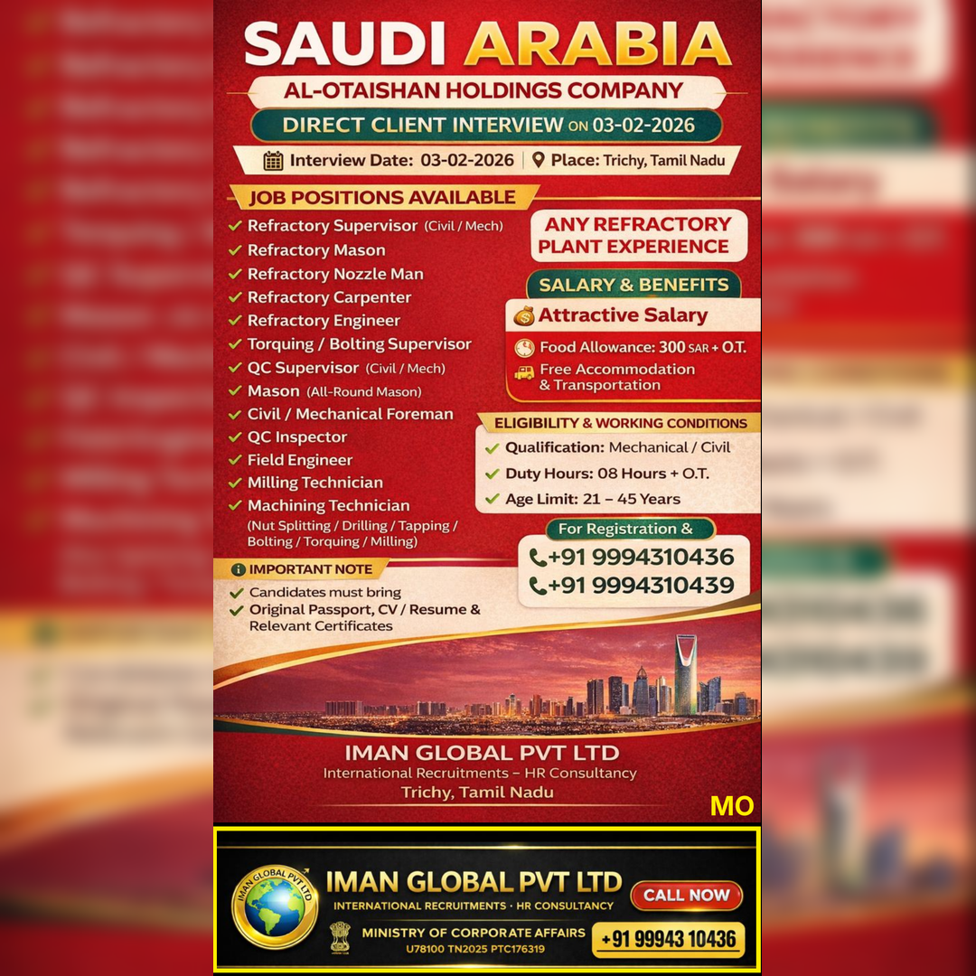 🌍 AL ARAB ARAFA OVERSEAS MANPOWER CONSULTANCY “Your Future Begins Here – UAE” 🔹 A LEADING COMPANY – UAE 🔹 Direct Client Interview 📍 Interview Location: Trichy 📅 Date: 01-02-2026…
