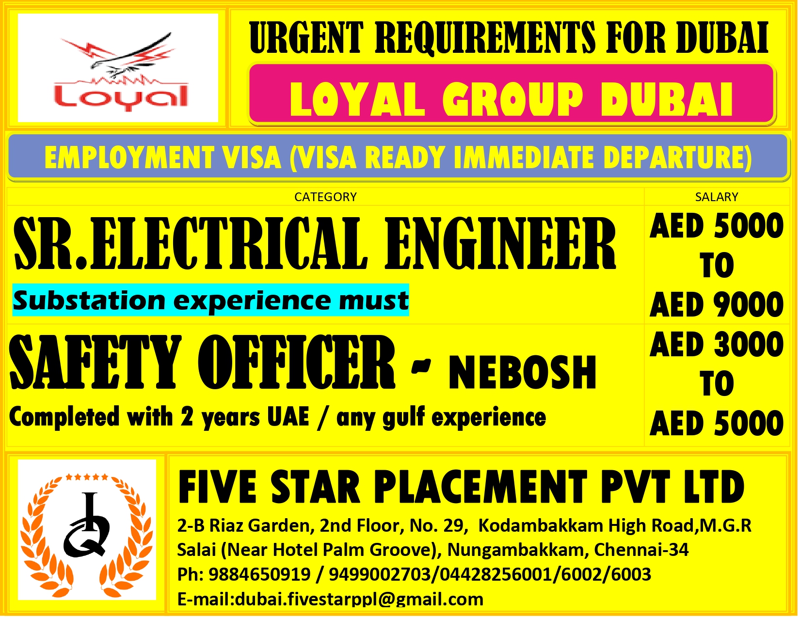 URGENT REQUIREMENT FOR DUBAI Interested candidates can share your cv along with all credentials below Mail IdEMAIL:[email protected] NO : 9884650919/044-28256001/28256002/28256003