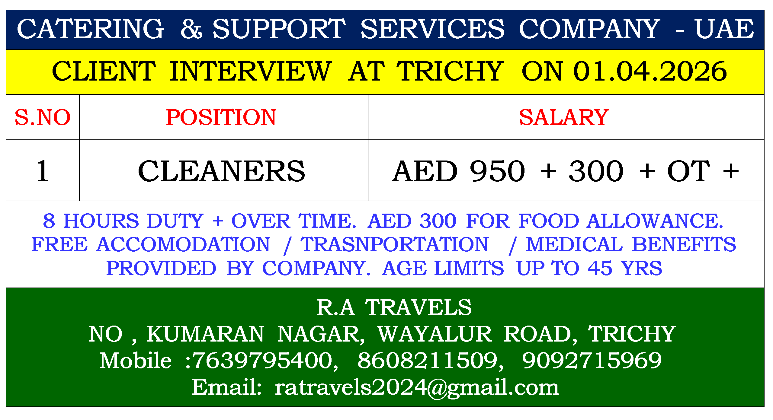 8 HOURS DUTY + OVER TIME. AED 300 FOR FOOD ALLOWANCE. FREE ACCOMODATION / TRASNPORTATION / MEDICAL BENEFITS PROVIDED BY COMPANY. AGE LIMITS UP TO 45 YRS |