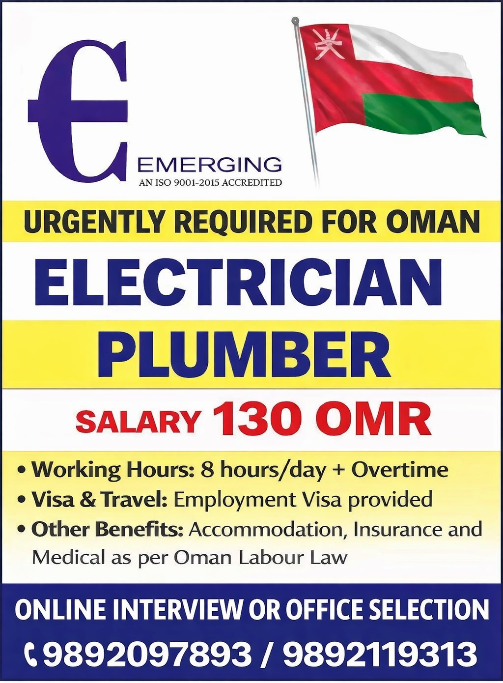 Other Benefits: Accommodation, Insurance and Medical as per Oman Labour Law