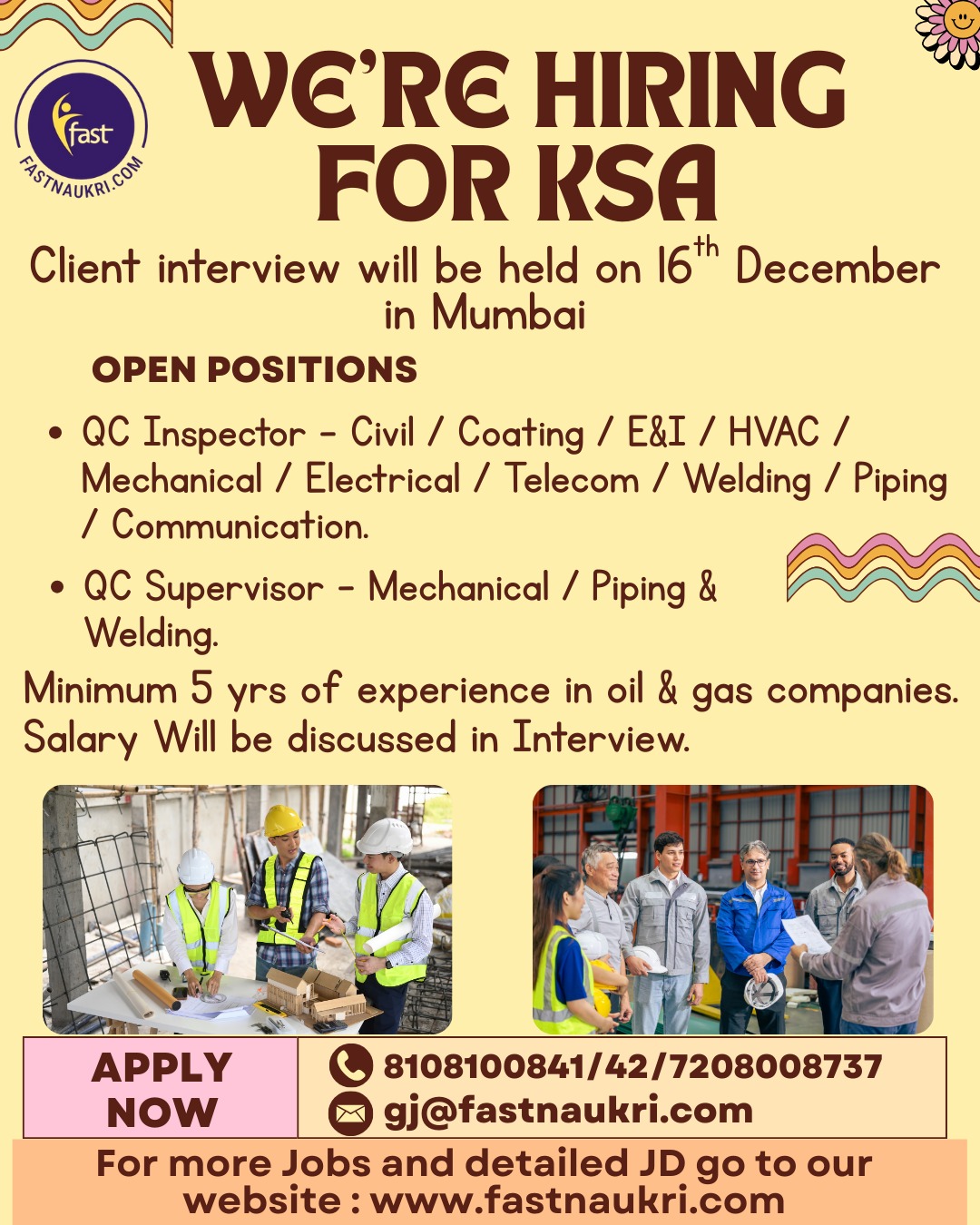 🇸🇦💼 #HiringForKSA 👷♂️🛠️ #QCVacancies 🏗️📋 #QCInspector 🔍⚙️ #QCSupervisor 🏭🔧 #OilAndGasJobs 🛢️👨🏭 #OilAndGasIndustry 👷♀️📐 #CivilInspector 🎨🔧 #CoatingInspector ⚡🛠️ #ElectricalInspector 🧰📡 #TelecomInspector 🔧🔥 #MechanicalInspector 🌬️🛠️ #HVACJobs 🧪🔍 #WeldingInspector 🧵🔧 #PipingInspector 🏭🚀 #EngineeringJobs 🇸🇦✈️ #SaudiJobs 📍🗓️ #ClientInterview 🧑🔧🌟 #ExperiencedProfessionals 📞📩 #ApplyNow 🌍🚀 #FastNaukri 🔧🛠️ #TechnicalJobs 🏗️🎯 #ConstructionJobs 👨🏭📊 #IndustrialJobs🏭👷♂️ #QCRoles 🔧📏 #InspectionJobs 🛢️🚀 #OilGasCareers 🏗️⚙️ #ProjectInspection 🔍🛠️ #QualityControlJobs 🌍🇸🇦 #SaudiArabiaJobs 👨🏭🧰 #TechnicalExperts 📡⚙️ #EandIJobs 🧯🔧 #SafetyAndQuality 🛠️💼 #FieldInspection 👷♀️🔍 #SiteInspector 🏭📐 #EngineeringProfessionals 📚💡 #5YearsExperience ✈️☎️ #ImmediateHiring 🧑🏭🌟 #SkilledWorkforce 🔧🚧 #MechJobs 🧵⚙️ #PipingJobs 🔥🛠️ #WeldingJobs 🏆🚀 #CareerOpportunity 📢📨 #ApplyToday