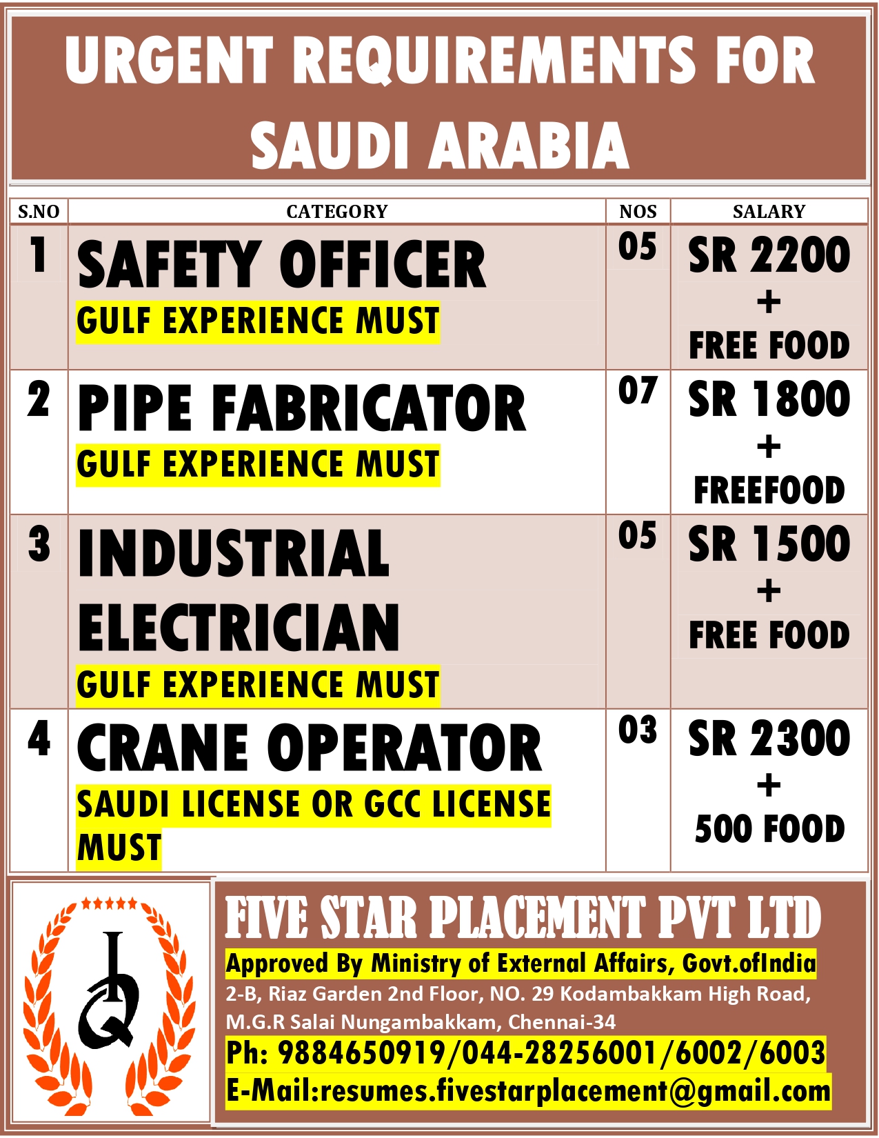 Daily Job Alert Join the Whatsapp Channel Join Now URGENT REQUIREMENT FOR SAUDI ARABIA Interested candidates can share your cv along with all credentials below Mail Id EMAIL:[email protected] CONTACT NO : 9884650919/044-28256001/28256002/28256003 Post navigation RK GULF TRAVELS, BHILAI. FIVE STAR PLACEMENT PVT LTD