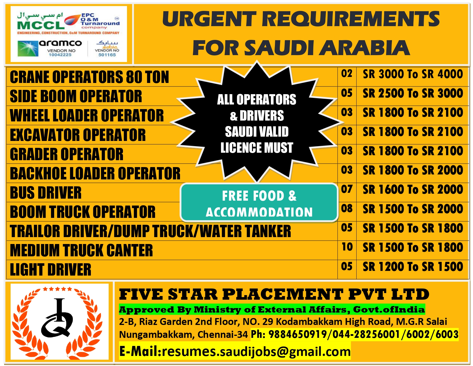 Daily Job Alert Join the Whatsapp Channel Join Now URGENT REQUIREMENT FOR SAUDI ARABIA Interested candidates can share your cv along with all credentials below Mail Id EMAIL:[email protected] CONTACT NO : 9884650919/044-28256001/28256002/28256003 Post navigation FIVE STAR PLACEMENT PVT LTD EMERGING CONSULTANCY SERVICES