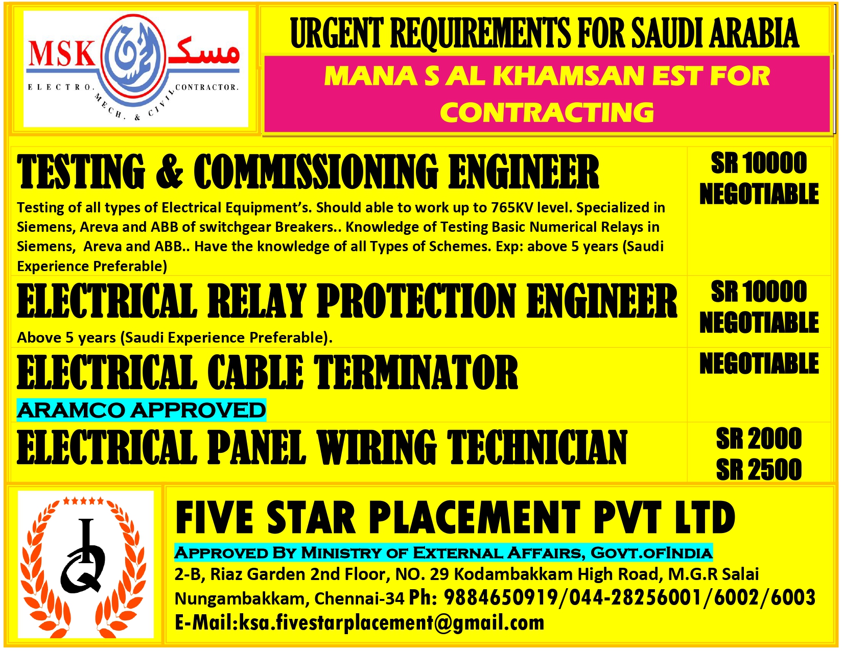 Daily Job Alert Join the Whatsapp Channel Join Now URGENT REQUIREMENT FOR SAUDI ARABIA Interested candidates can share your cv along with all credentials below Mail Id EMAIL:[email protected] CONTACT NO : 9884650919/044-28256001/28256002/28256003 Post navigation FIVE STAR PLACEMENT PVT LTD FASTNAUKRI.COM