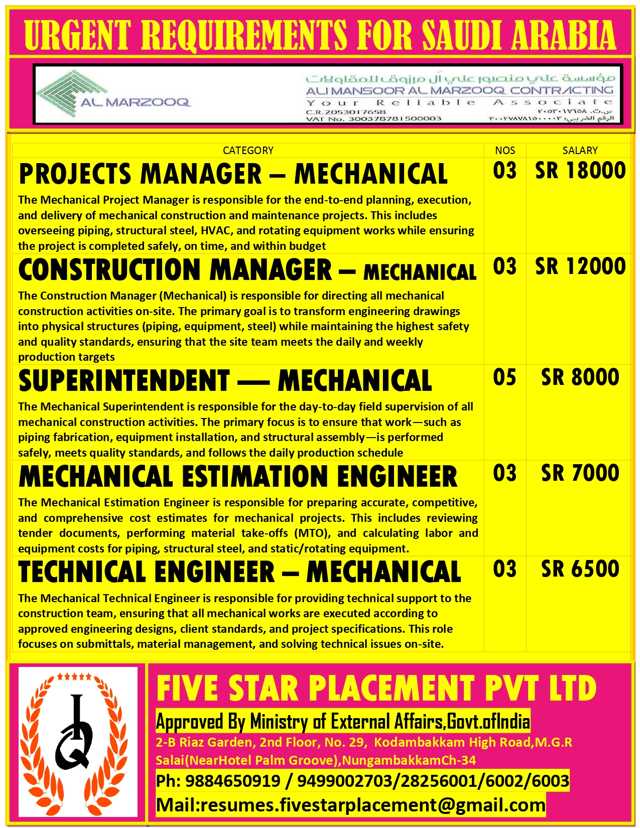 Daily Job Alert Join the Whatsapp Channel Join Now URGENT REQUIREMENT FOR SAUDI ARABIA Interested candidates can share your cv along with all credentials below Mail IdEMAIL:[email protected]CONTACT NO : 9884650919/044-28256001/28256002/28256003 Post navigation FIVE STAR PLACEMENT PVT LTD Emerging Consultancy Services – Mumbai