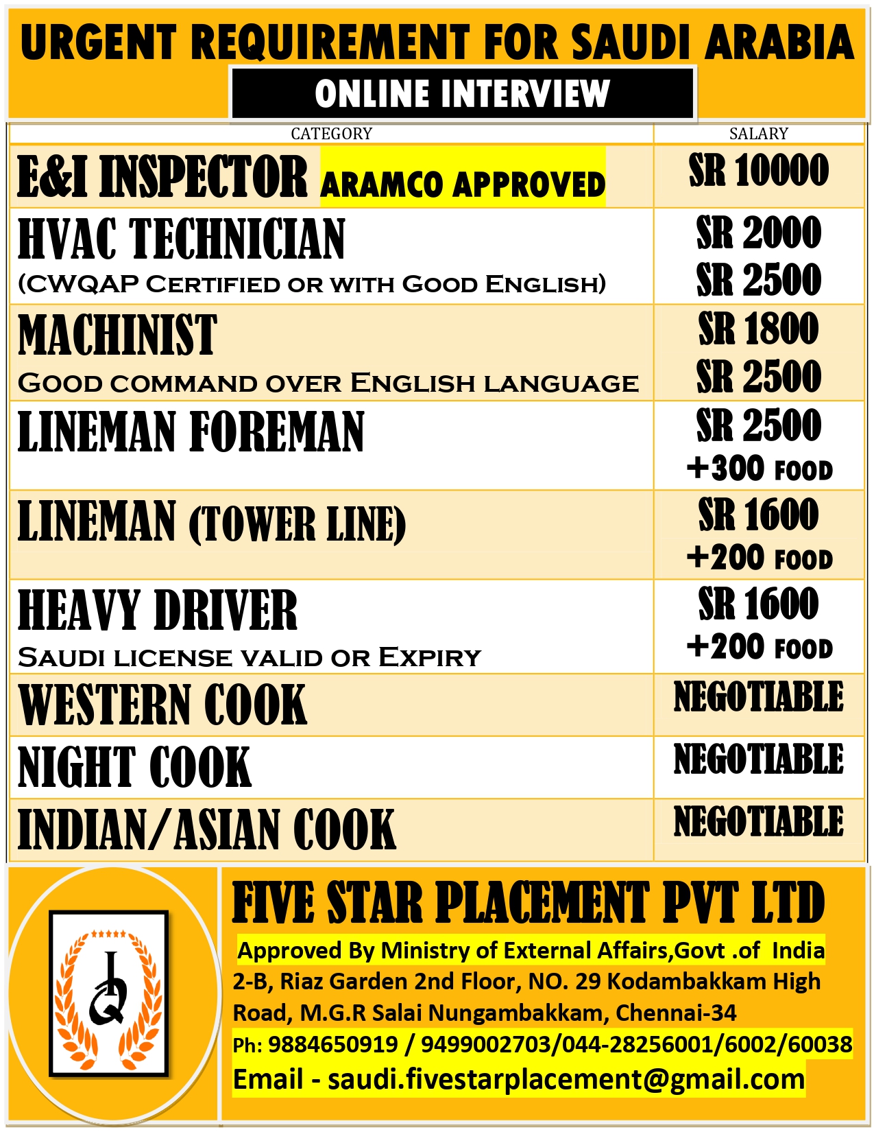 URGENT REQUIREMENT FOR SAUDI ARABIA