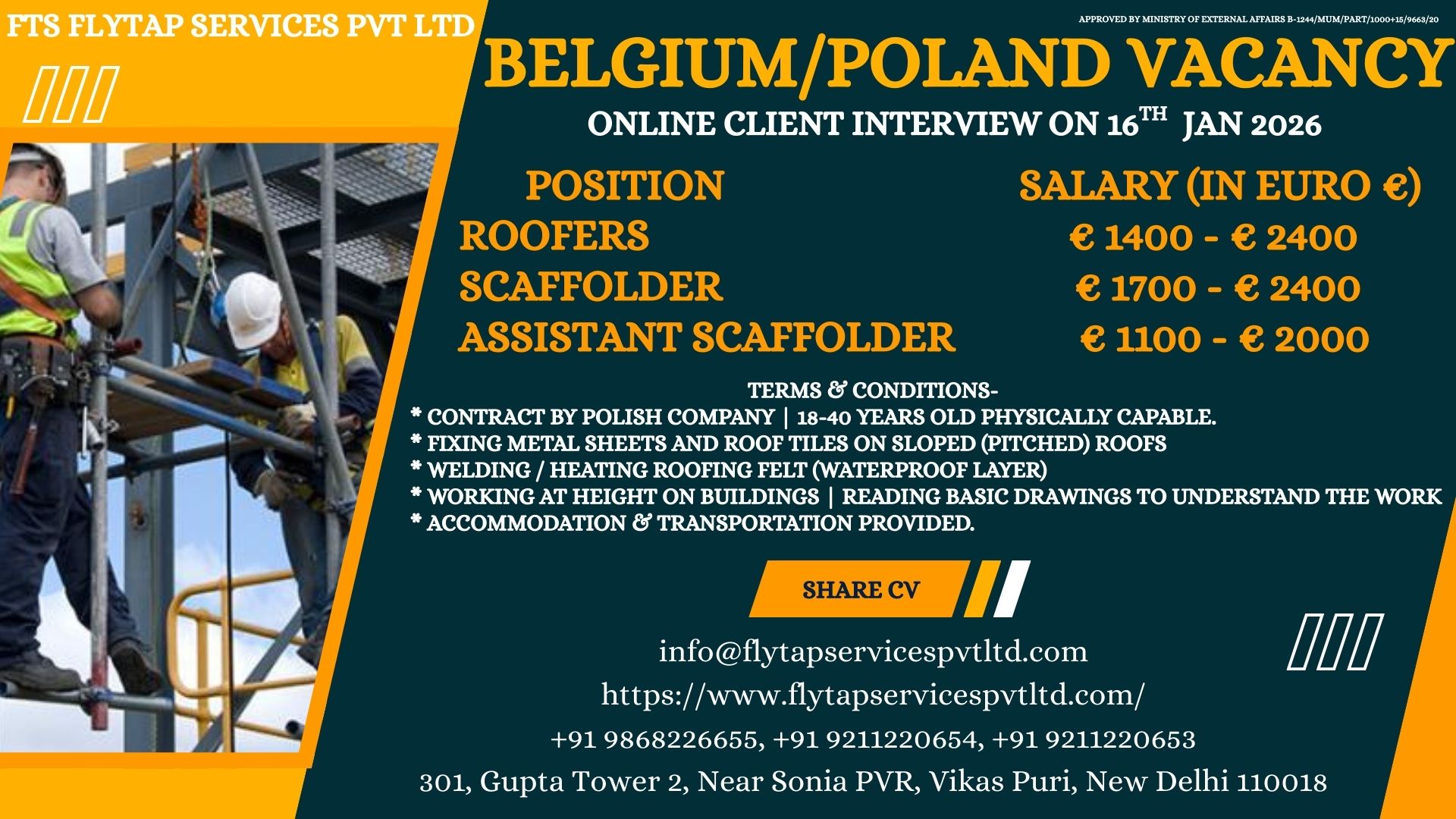 FTS Flytap Services Pvt Ltd is inviting applications for skilled and semi-skilled professionals for Belgium / Poland projects, under a Polish company contract. This is an excellent opportunity for candidates with experience in roofing and scaffolding works to work in Europe with attractive salaries and employer-provided facilities.
