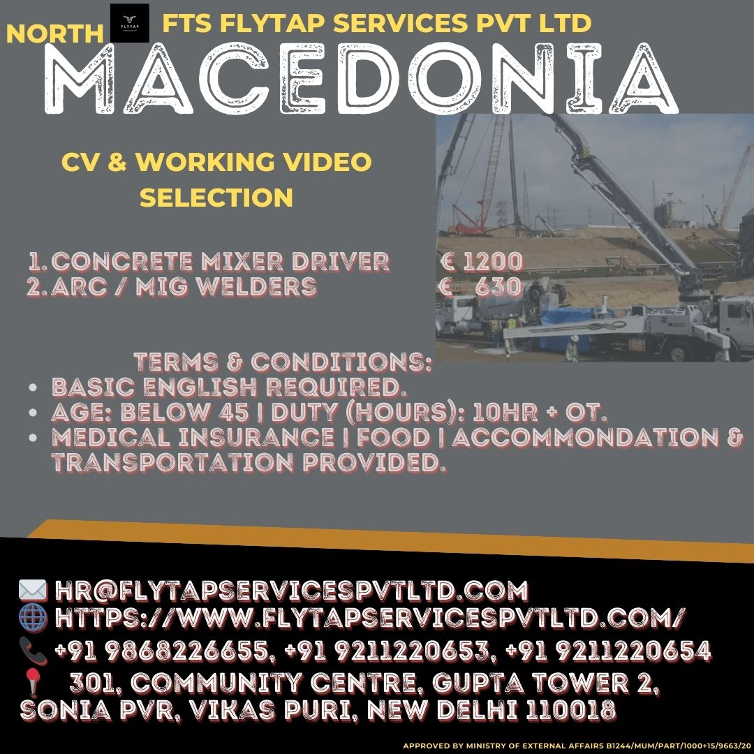 FTS Flytap Services Pvt. Ltd. is inviting applications for immediate deployment to North Macedonia under a reputed overseas employer. Selection will be conducted through CV shortlisting and video interview process.