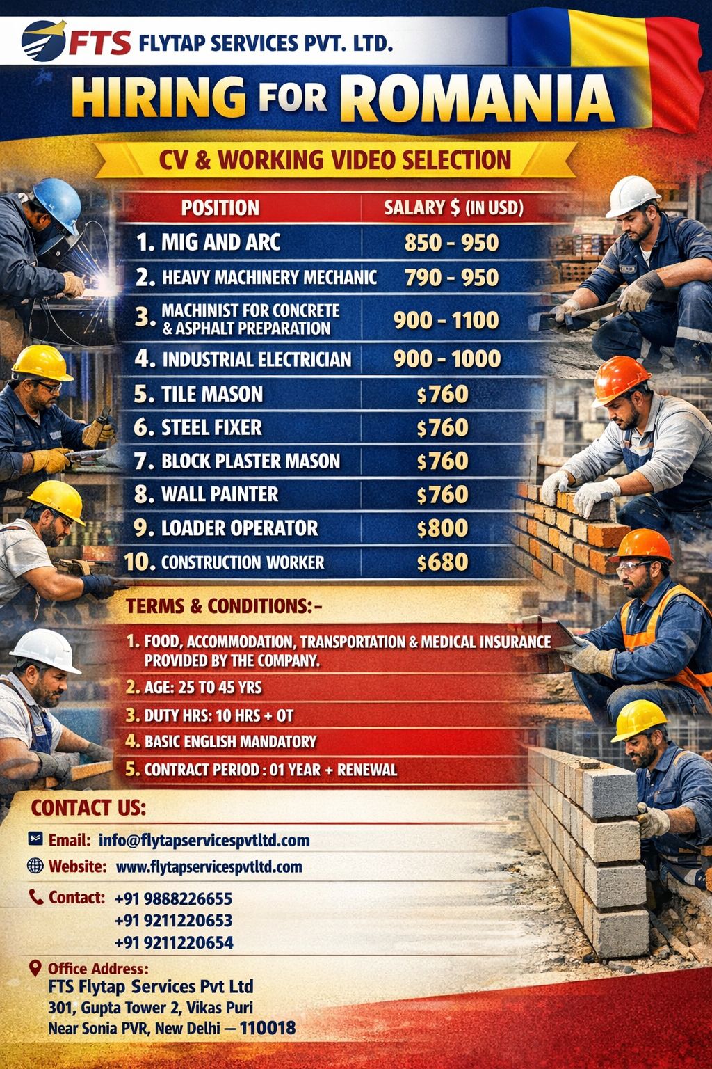 We are urgently hiring skilled and unskilled candidates for Romania Construction & Industrial Projects. Selection will be done through CV and Working Video.