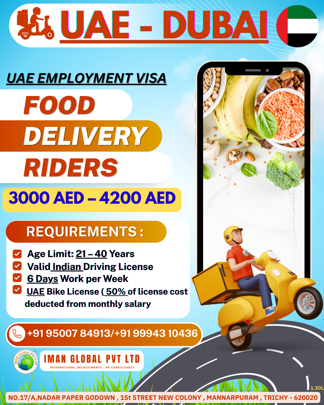 FOOD DELIVERY RIDERS ✔ Competitive Salary ✔ UAE Bike License (50% of license cost deducted from monthly salary) ✔ Flexible Working Hours ✔ Friendly & Supportive Team ✔ 6 Days Work per Week