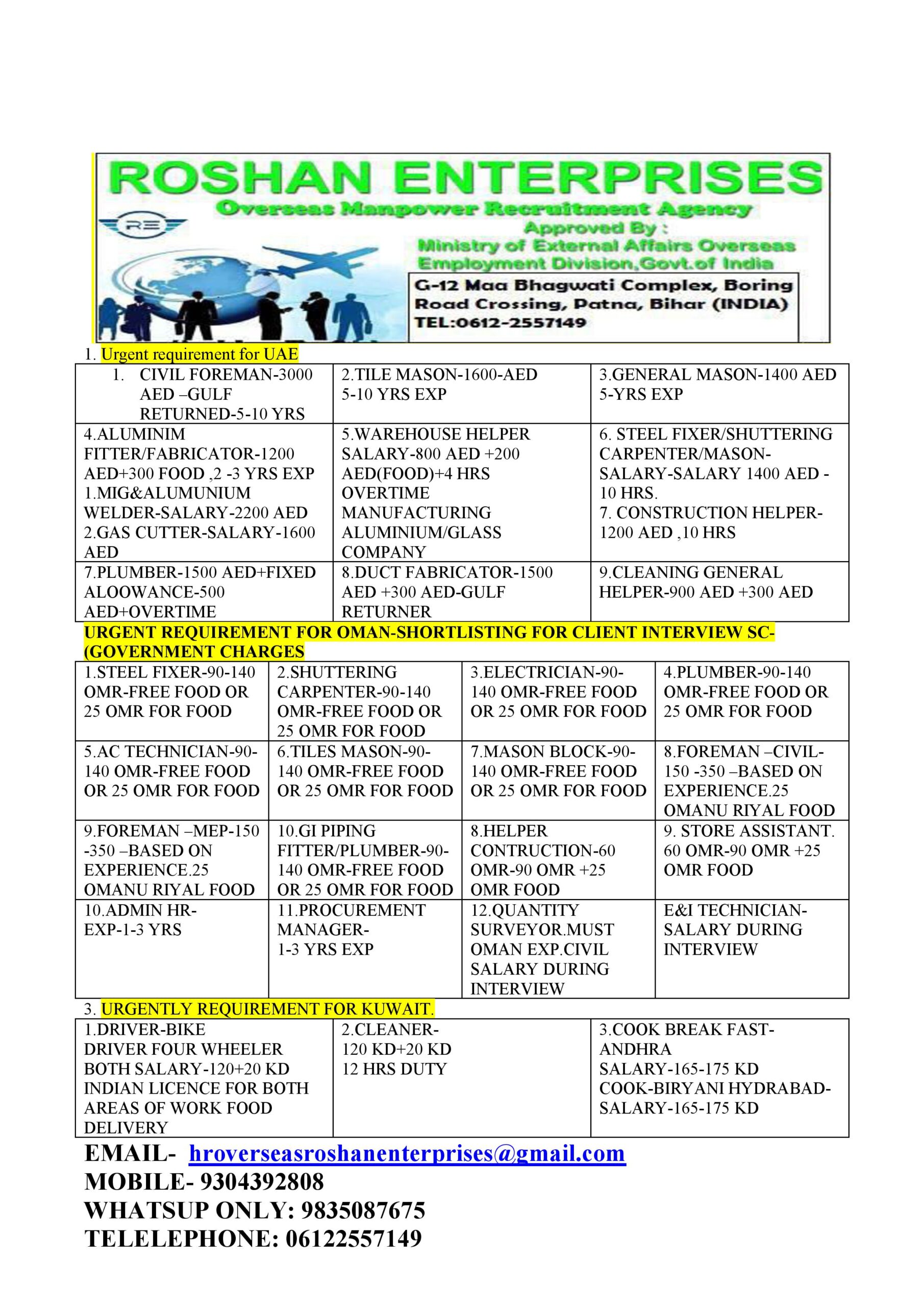 4.ALUMINIM FITTER/FABRICATOR-1200 AED+300 FOOD ,2 -3 YRS EXP 1.MIG&ALUMUNIUM WELDER-SALARY-2200 AED 2.GAS CUTTER-SALARY-1600 AED |