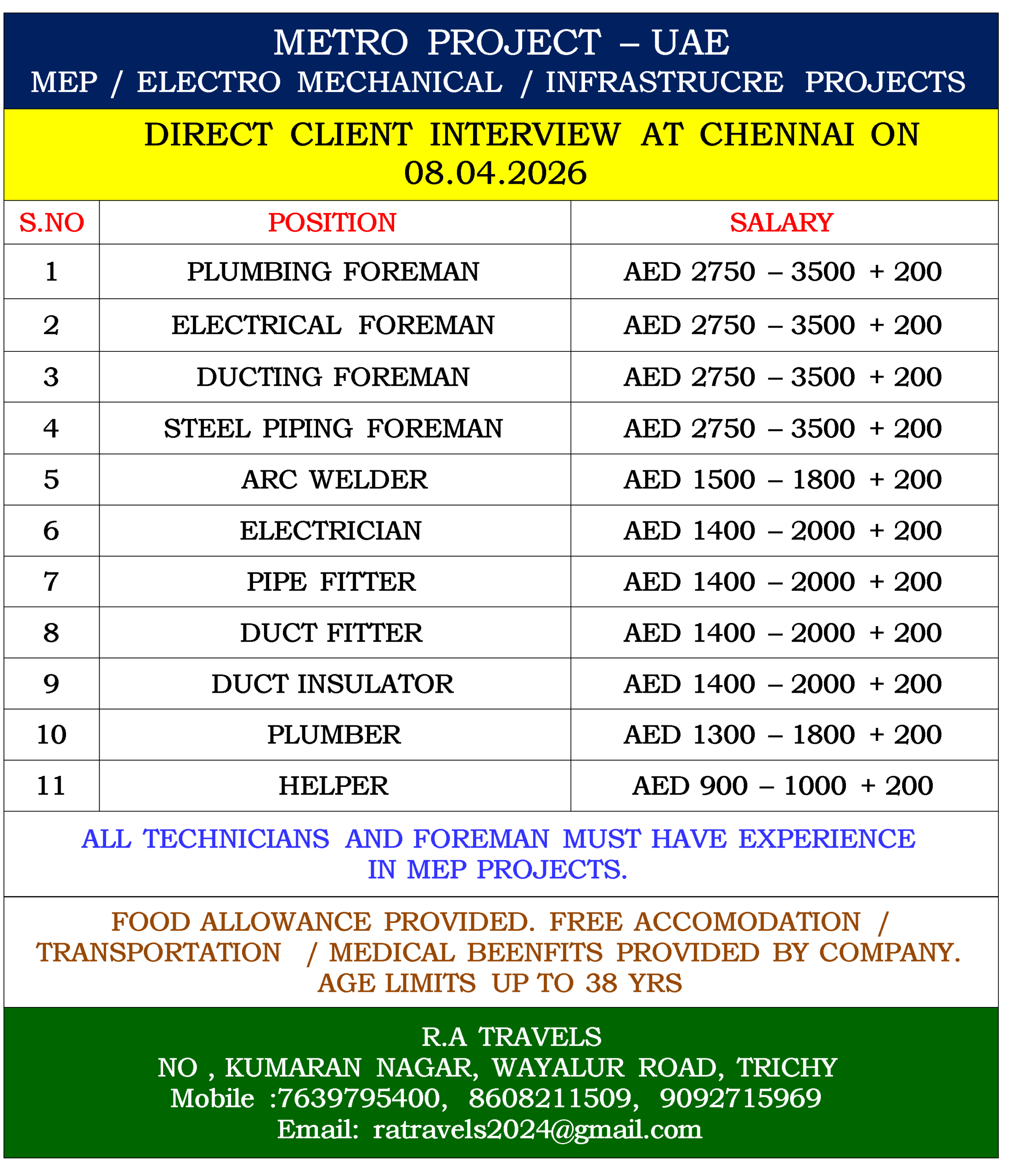 FOOD ALLOWANCE PROVIDED. FREE ACCOMODATION / TRANSPORTATION / MEDICAL BEENFITS PROVIDED BY COMPANY. AGE LIMITS UP TO 38 YRS