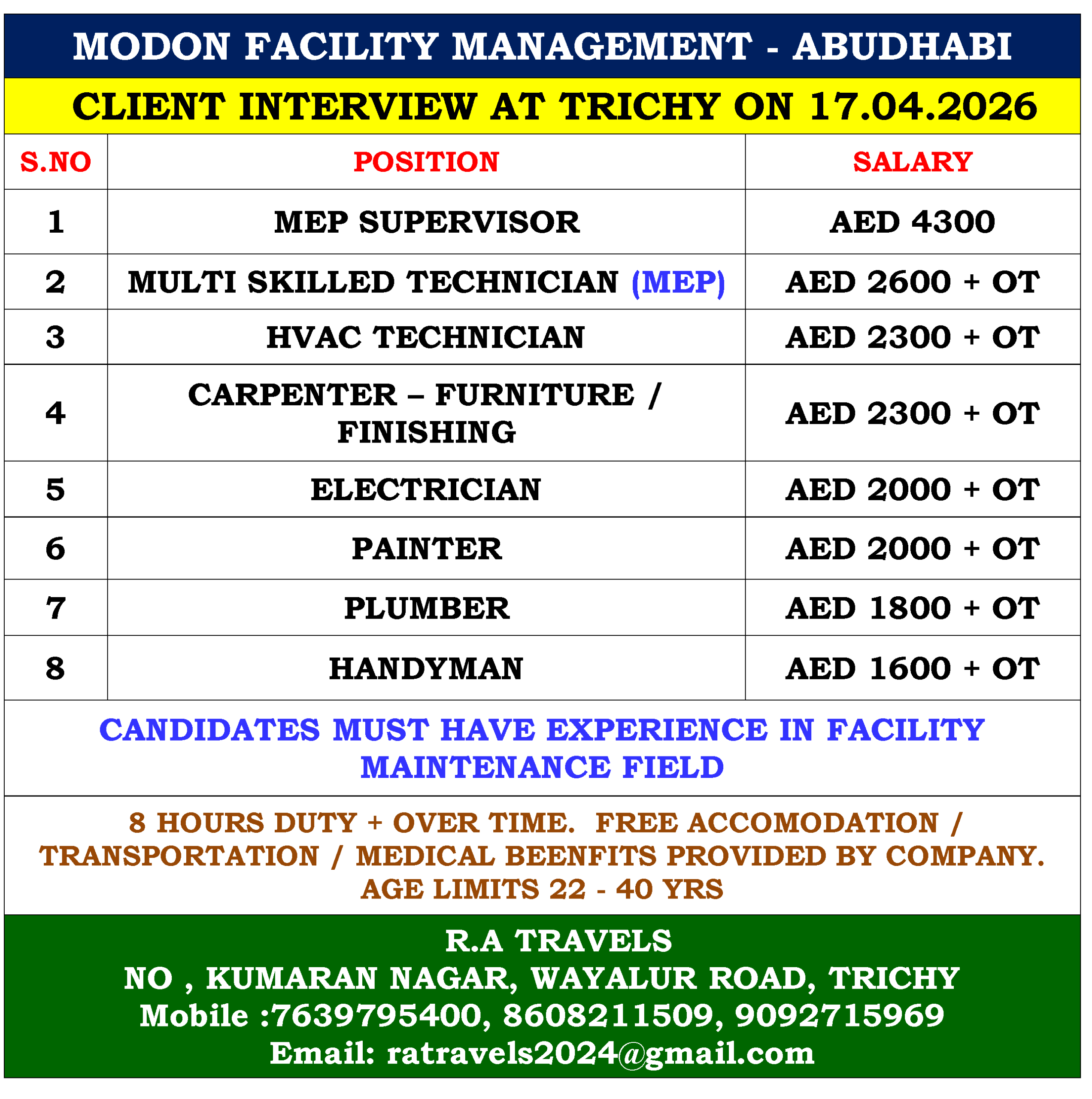 8 HOURS DUTY + OVER TIME.  FREE ACCOMODATION / TRANSPORTATION / MEDICAL BEENFITS PROVIDED BY COMPANY. AGE LIMITS 22 – 40 YRS