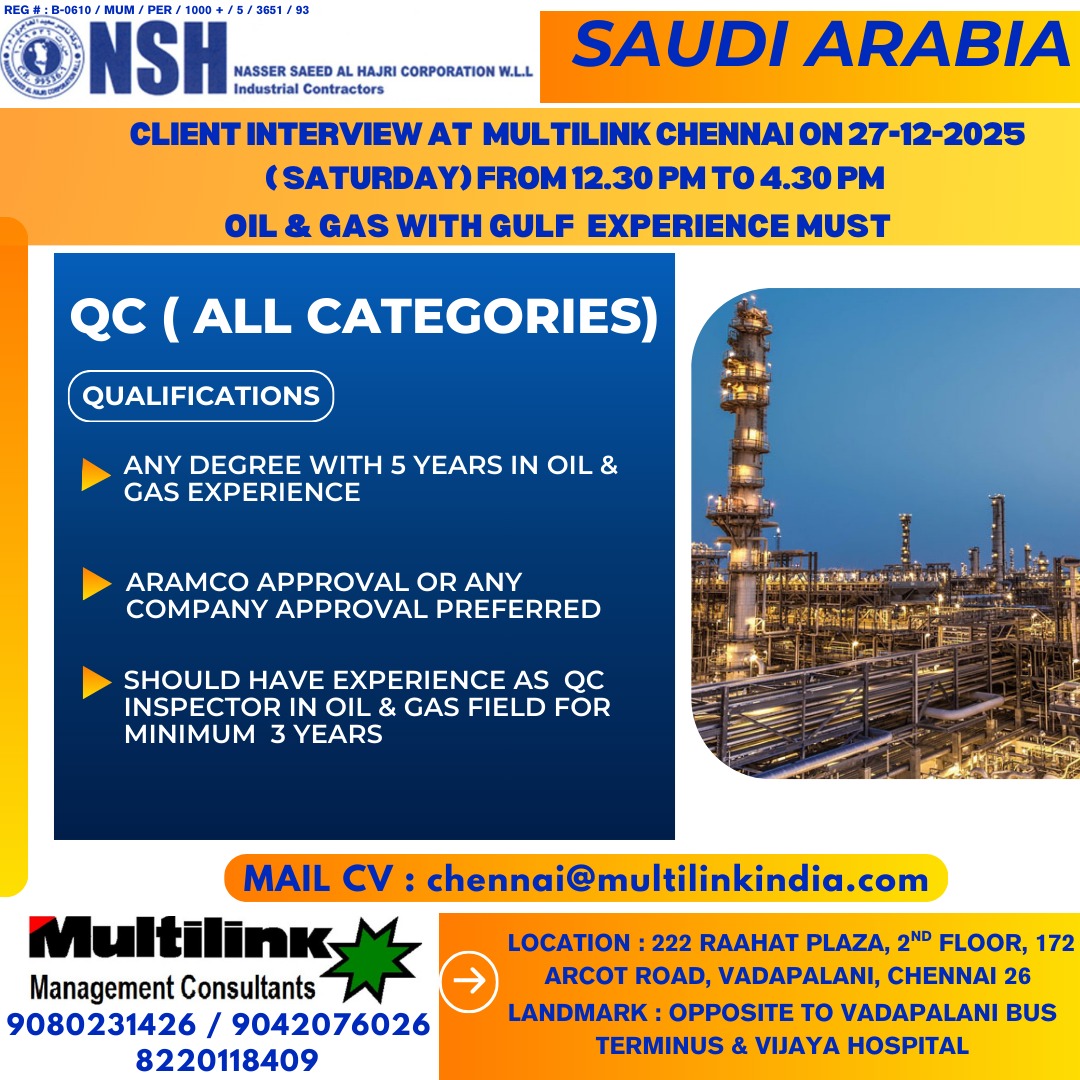 SAUDIARABIA Client Interview for QC Inspectors on 27-12-25 Saturday from 12.30PM onwards.
