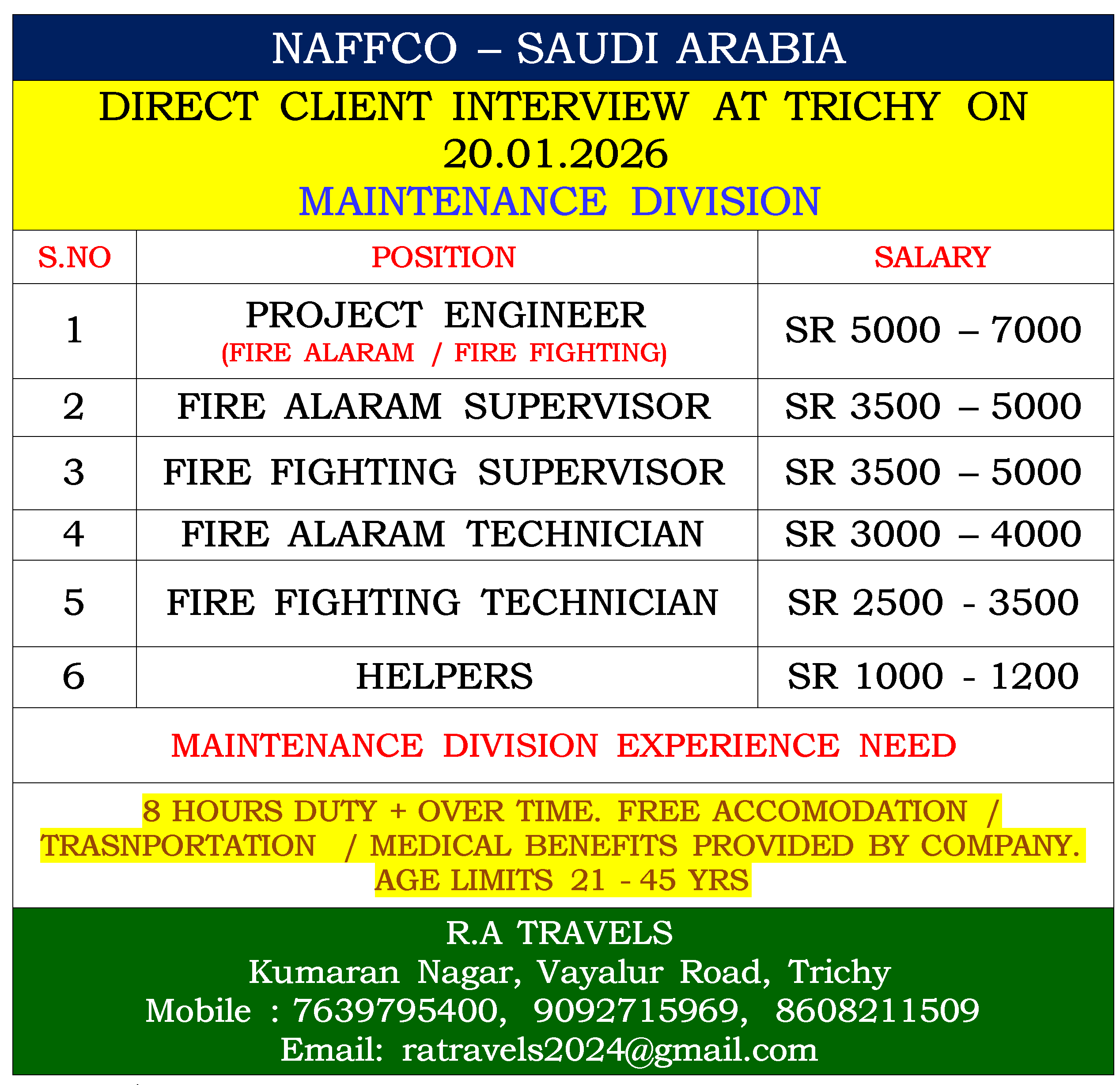 8 HOURS DUTY + OVER TIME. FREE ACCOMODATION / TRASNPORTATION / MEDICAL BENEFITS PROVIDED BY COMPANY. AGE LIMITS 21 – 45 YRS |