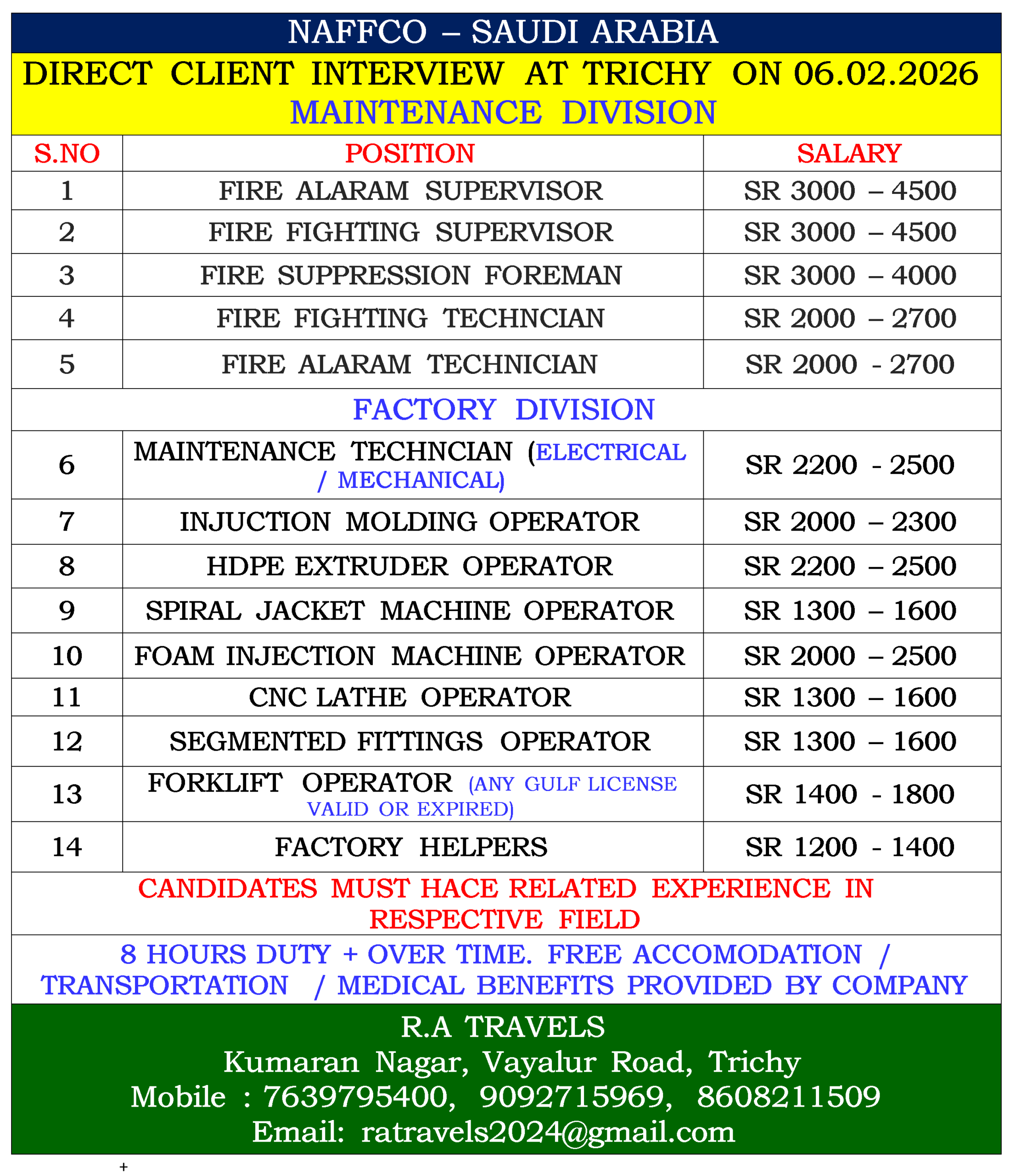 DIRECT CLIENT INTERVIEW AT TRICHY ON 06.02.2026 MAINTENANCE DIVISION |