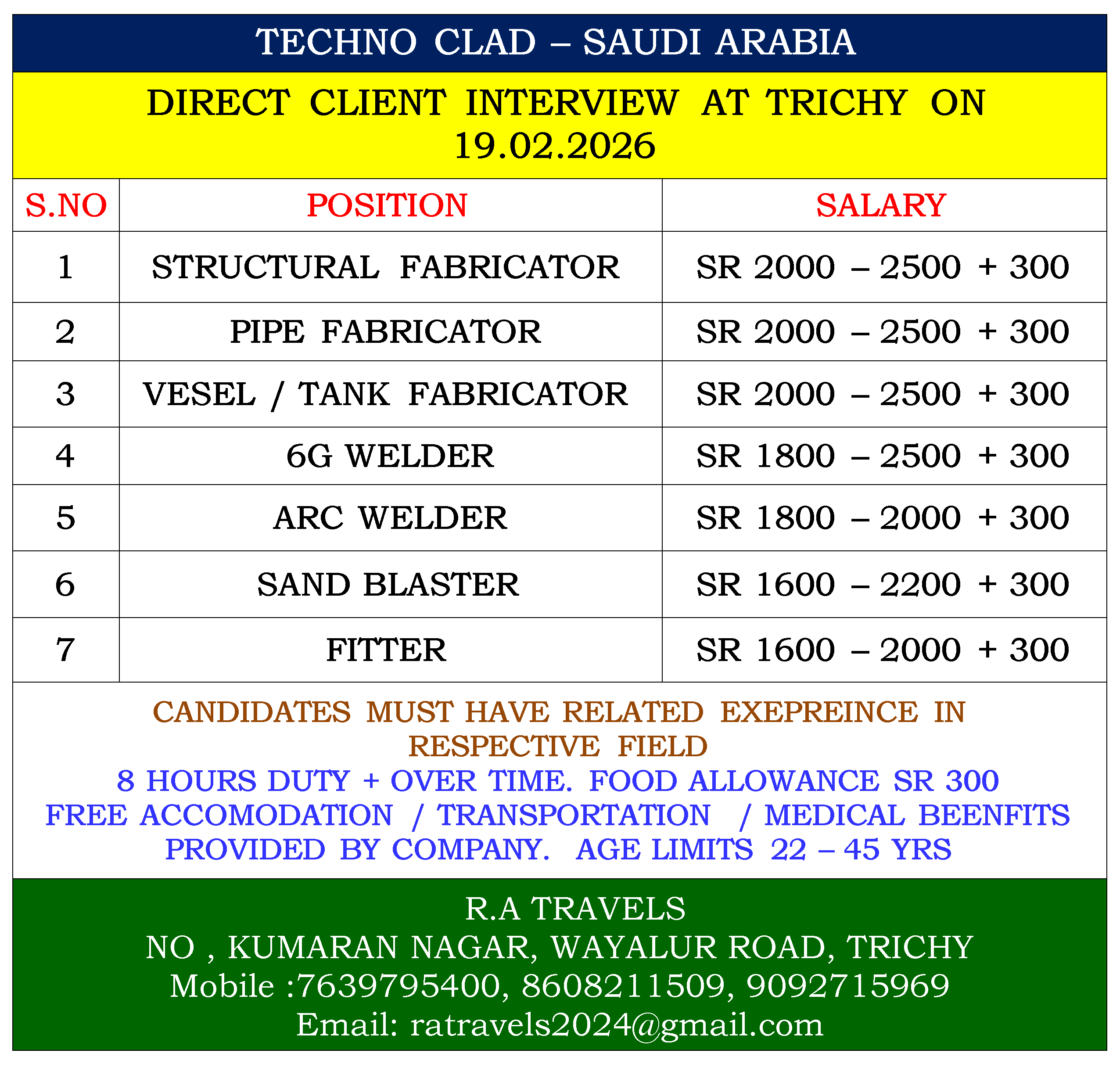 CANDIDATES MUST HAVE RELATED EXEPREINCE IN RESPECTIVE FIELD 8 HOURS DUTY + OVER TIME. FOOD ALLOWANCE SR 300 FREE ACCOMODATION / TRANSPORTATION / MEDICAL BEENFITS PROVIDED BY COMPANY. AGE LIMITS 22 – 45 YRS |