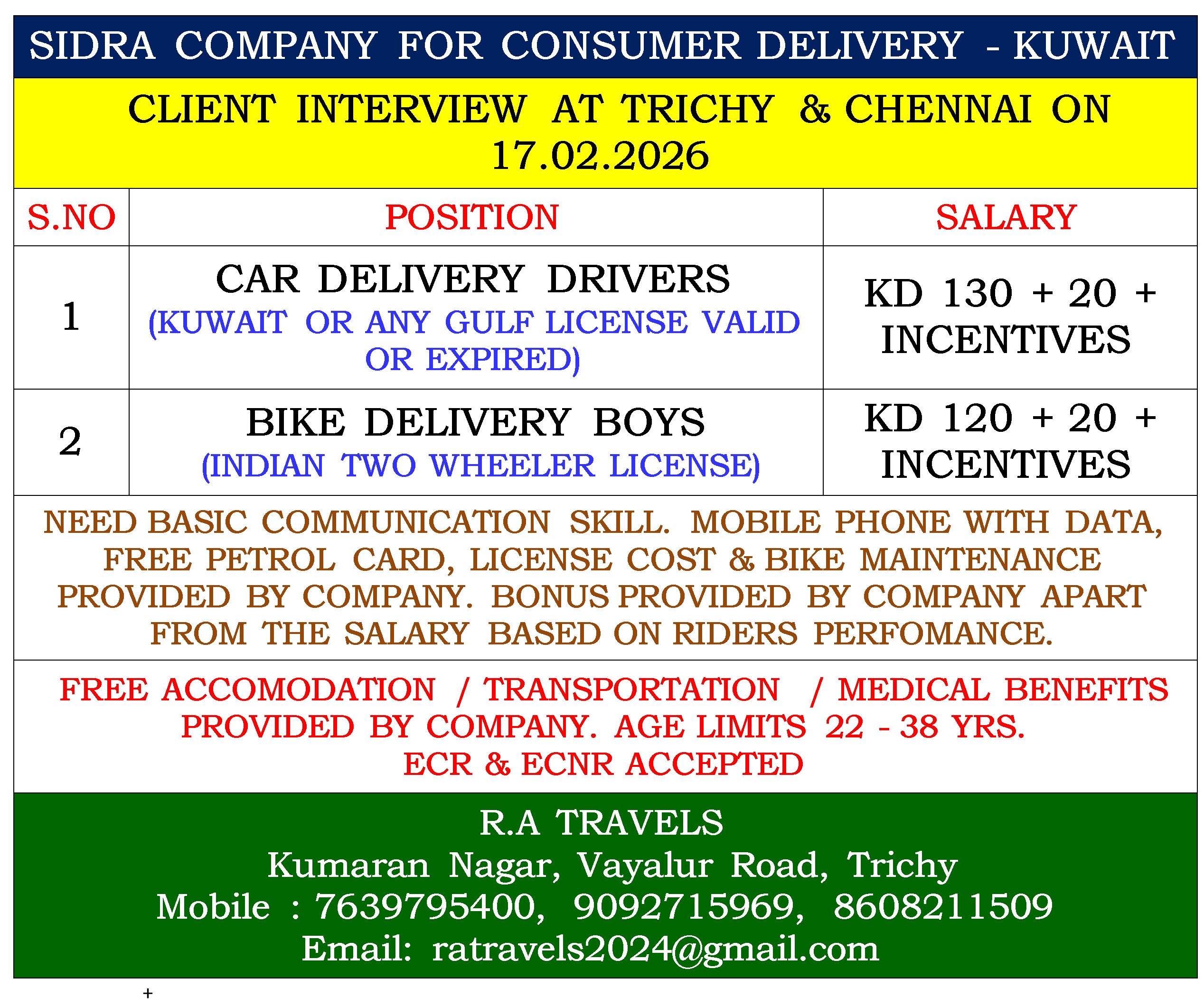 FREE ACCOMODATION / TRANSPORTATION / MEDICAL BENEFITS PROVIDED BY COMPANY. AGE LIMITS 22 – 38 YRS. ECR & ECNR ACCEPTED |
