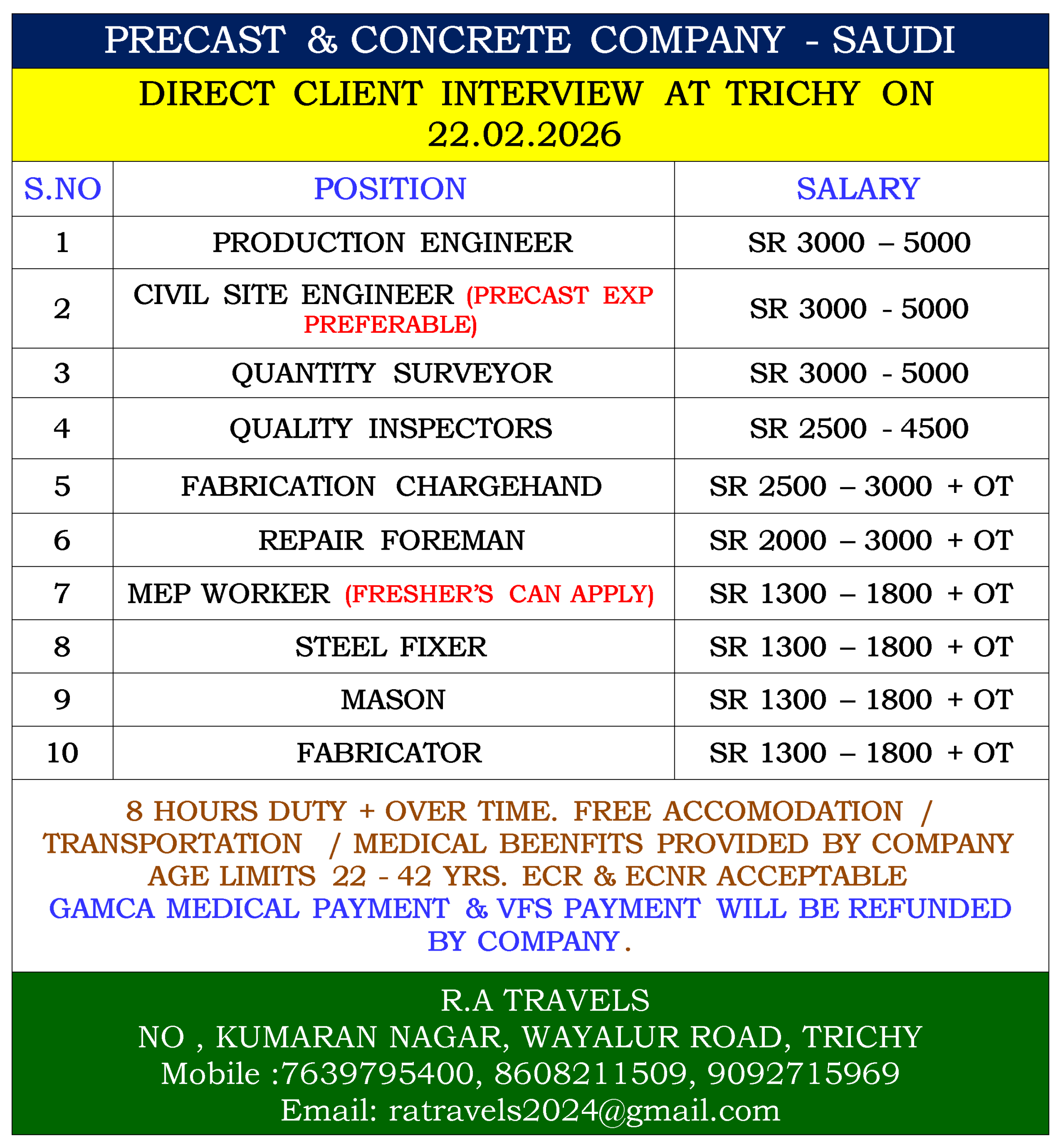 8 HOURS DUTY + OVER TIME. FREE ACCOMODATION / TRANSPORTATION / MEDICAL BEENFITS PROVIDED BY COMPANY AGE LIMITS 22 – 42 YRS. ECR & ECNR ACCEPTABLE GAMCA MEDICAL PAYMENT & VFS PAYMENT WILL BE REFUNDED BY COMPANY. |