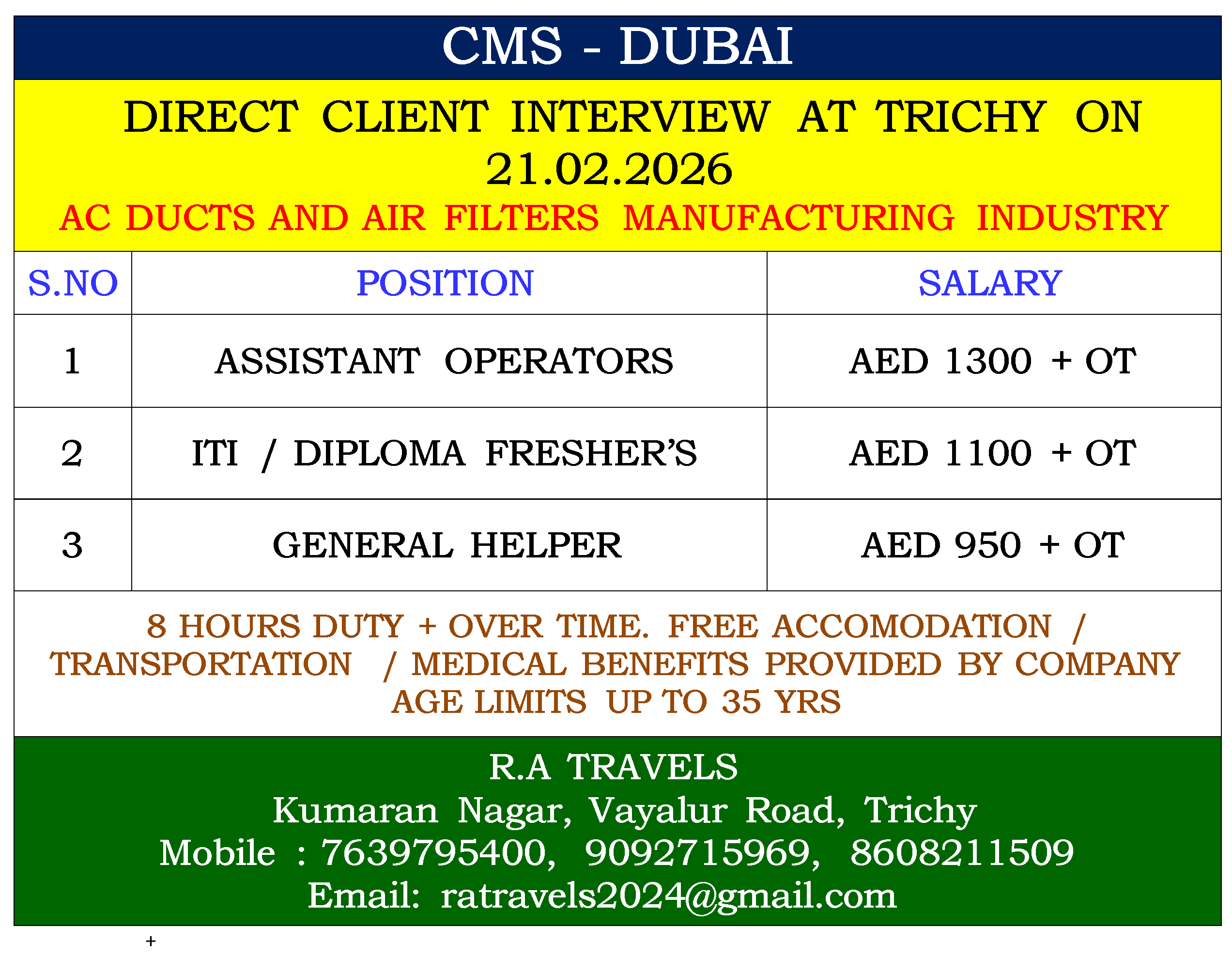 DIRECT CLIENT INTERVIEW AT TRICHY ON 21.02.2026 AC DUCTS AND AIR FILTERS MANUFACTURING INDUSTRY |
