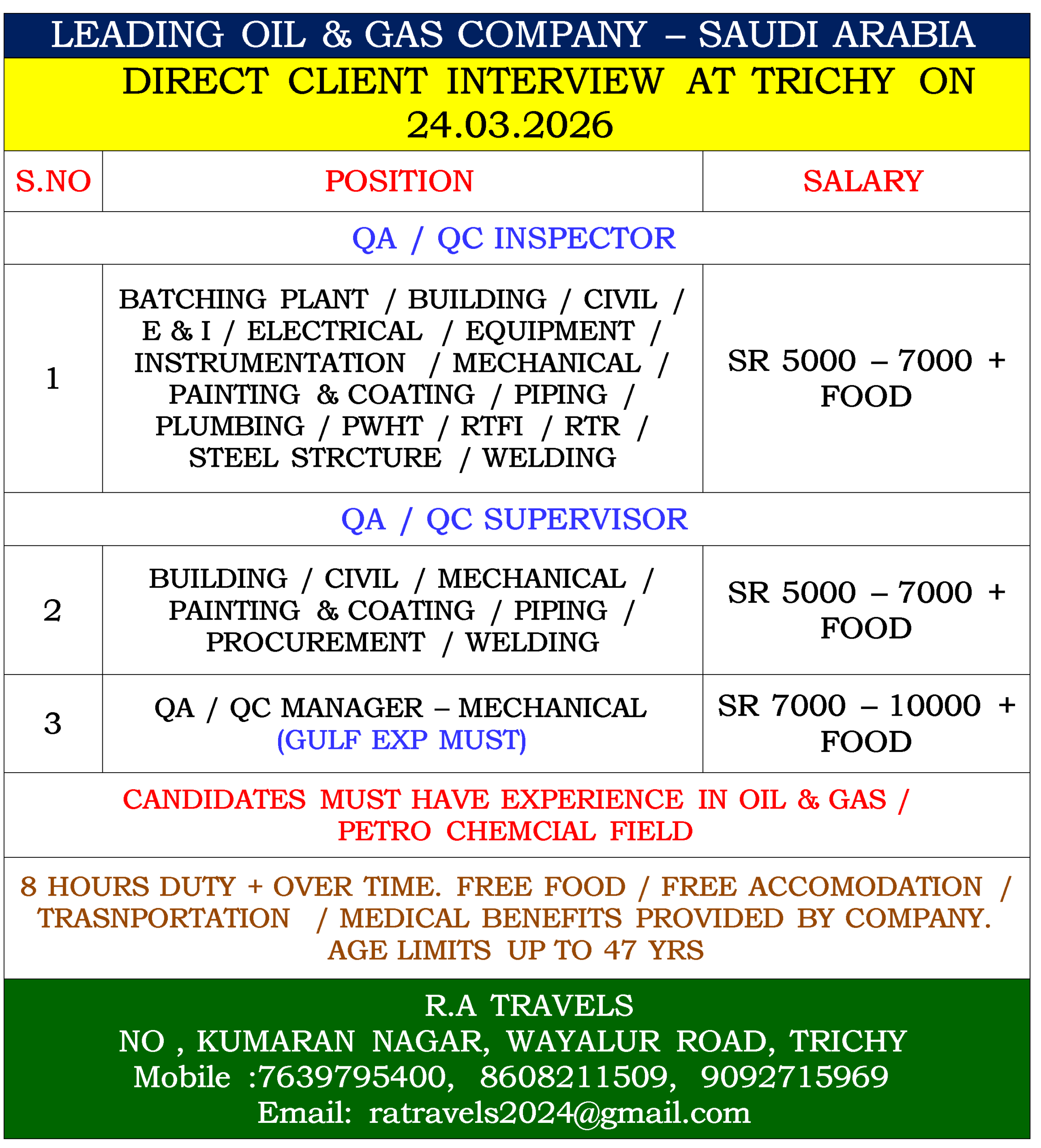 8 HOURS DUTY + OVER TIME. FREE FOOD / FREE ACCOMODATION / TRASNPORTATION / MEDICAL BENEFITS PROVIDED BY COMPANY. AGE LIMITS UP TO 47 YRS |
