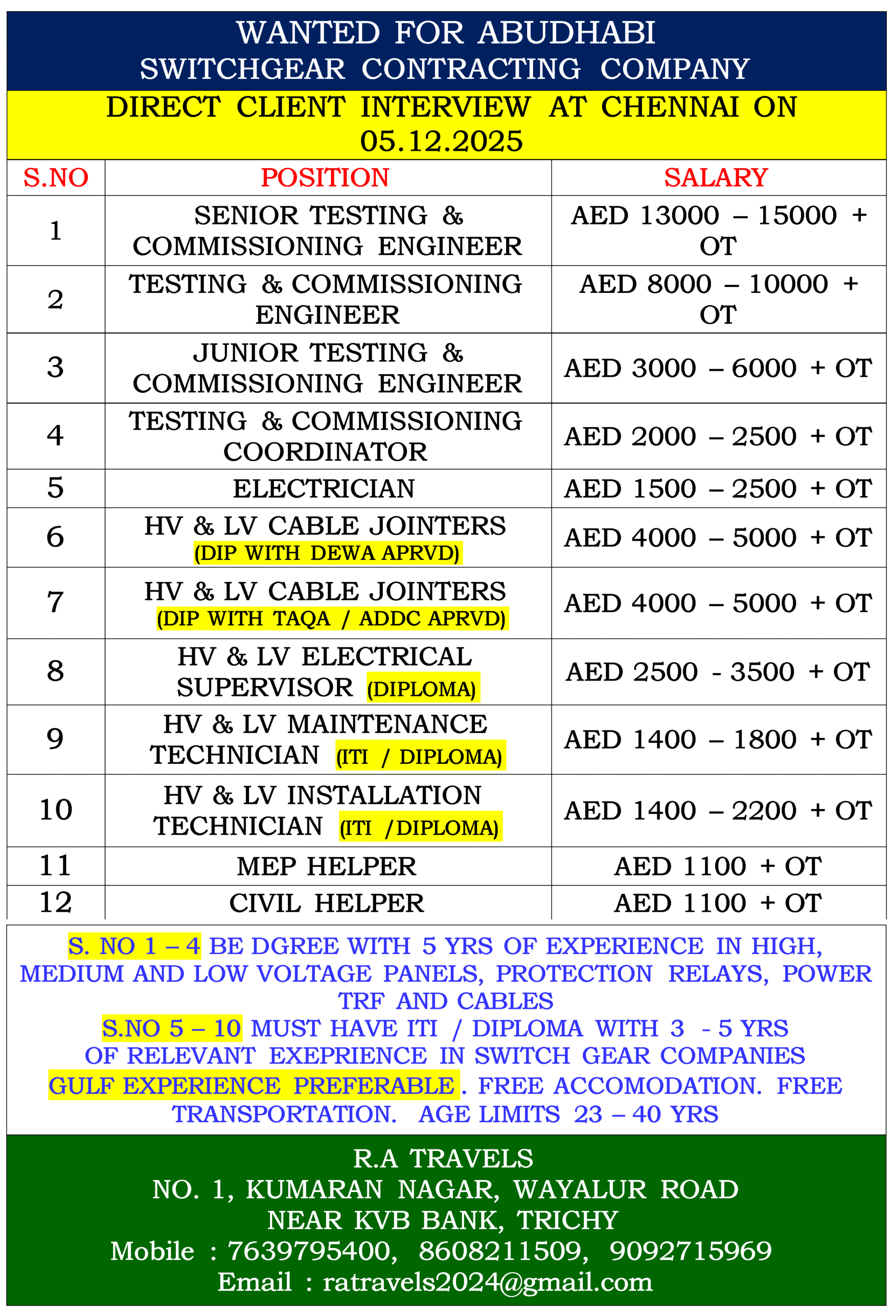 WANTED FOR ABUDHABI SWITCHGEAR CONTRACTING COMPANY |