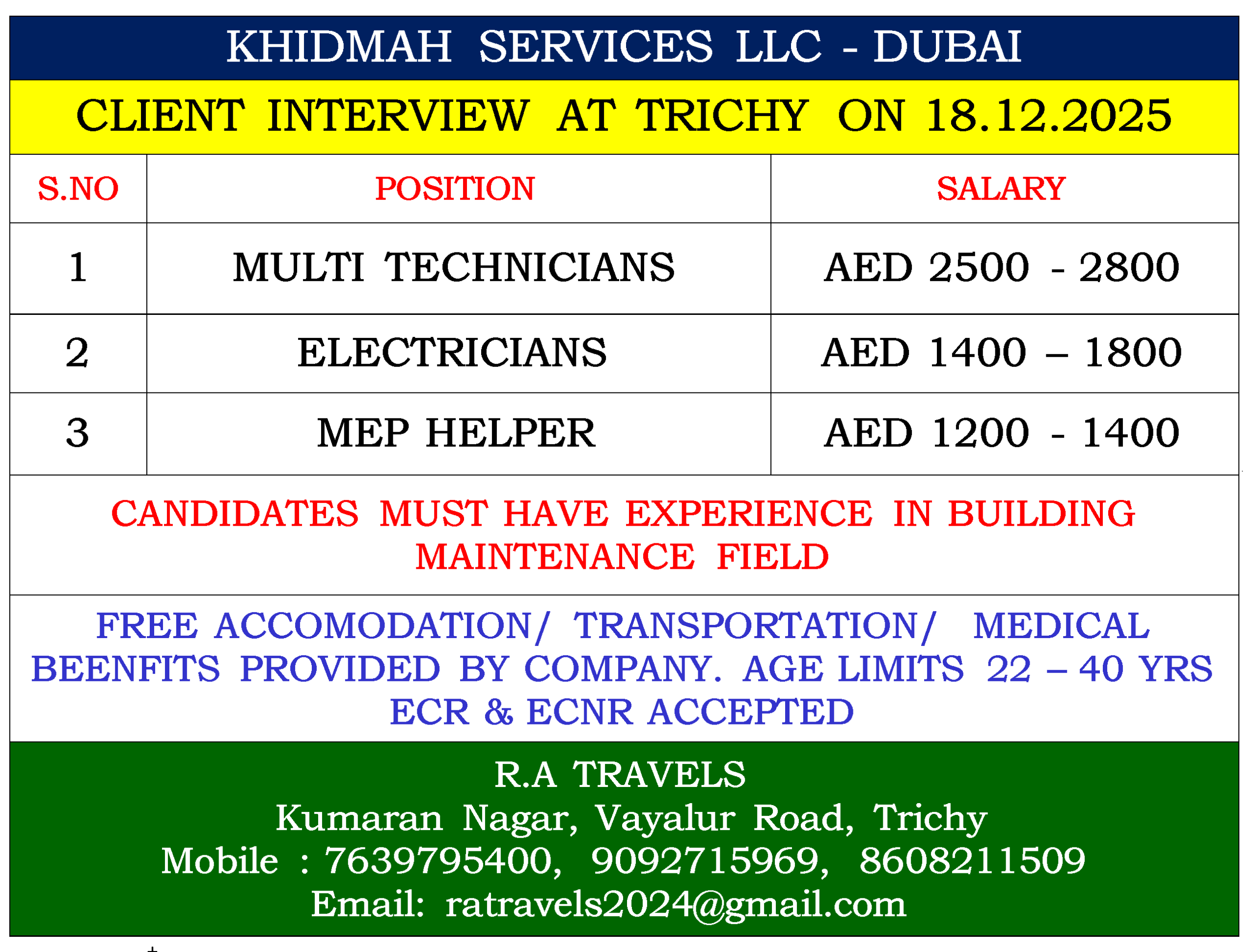 FREE ACCOMODATION/ TRANSPORTATION/ MEDICAL BEENFITS PROVIDED BY COMPANY. AGE LIMITS 22 – 40 YRS