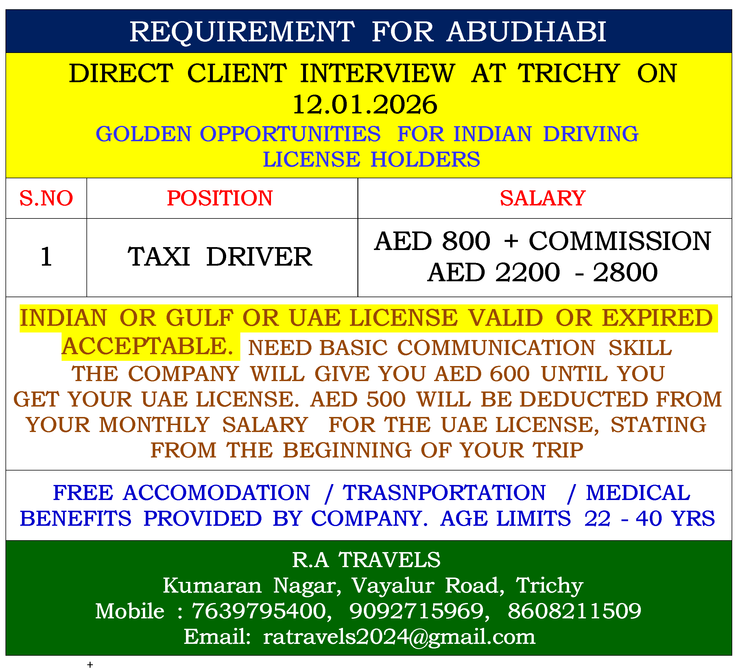 INDIAN OR GULF OR UAE LICENSE VALID OR EXPIRED ACCEPTABLE. NEED BASIC COMMUNICATION SKILL