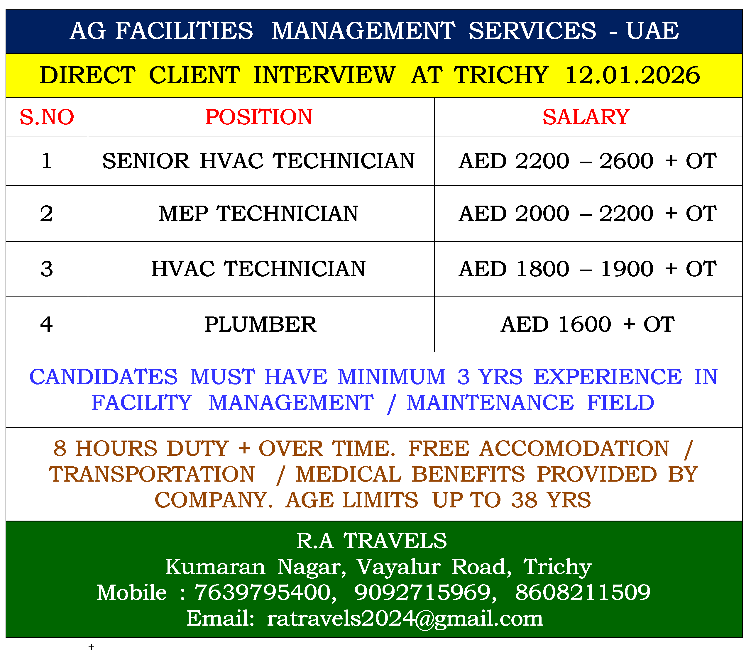 8 HOURS DUTY + OVER TIME. FREE ACCOMODATION / TRANSPORTATION / MEDICAL BENEFITS PROVIDED BY COMPANY. AGE LIMITS UP TO 38 YRS |