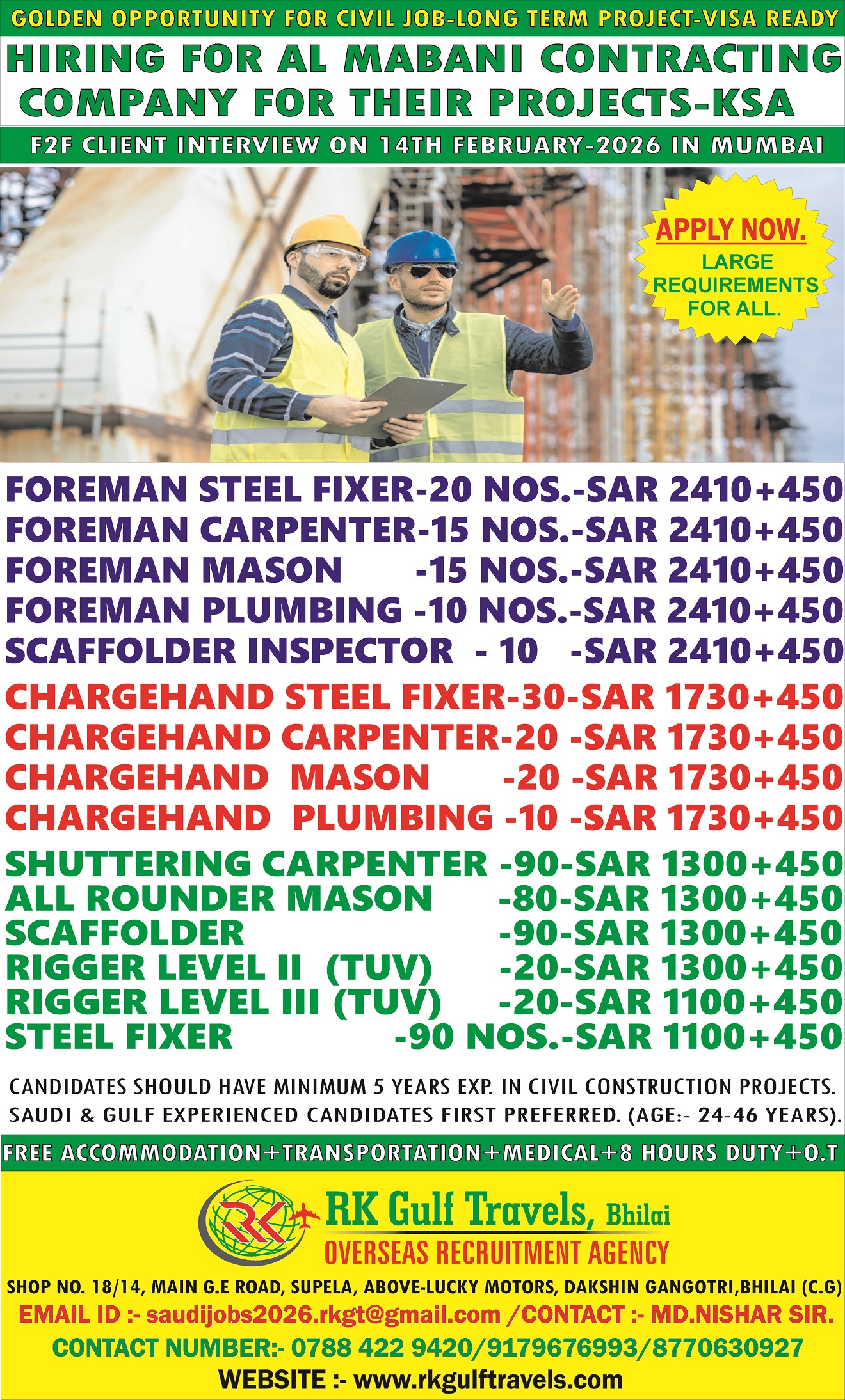 CANDIDATES SHOULD HAVE MINIMUM 5-6 YEARS EXPERIENCE IN CONSTRUCTION PROJECTS /GCC EXP. PREFERRED.. Age Limit :- 24 to 46 Years.