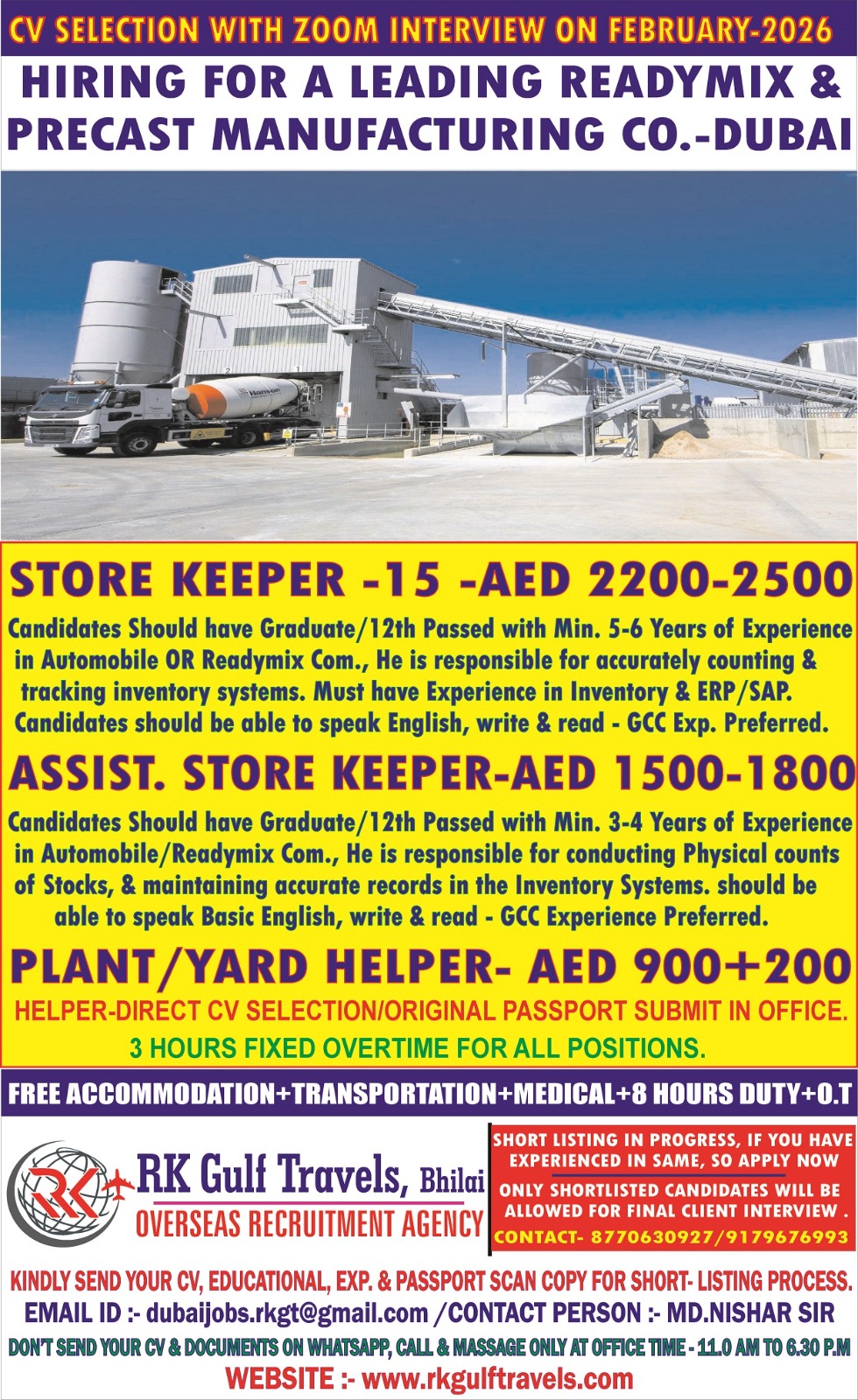 CANDIDATES SHOULD HAVE MINIMUM 5-6 YEARS EXPERIENCE IN READY MIX COMPANY OR AUTO MOBILE INDUSTRY /GCC EXP. PREFERRED. Age Limit :- 22 to 45 Years.
