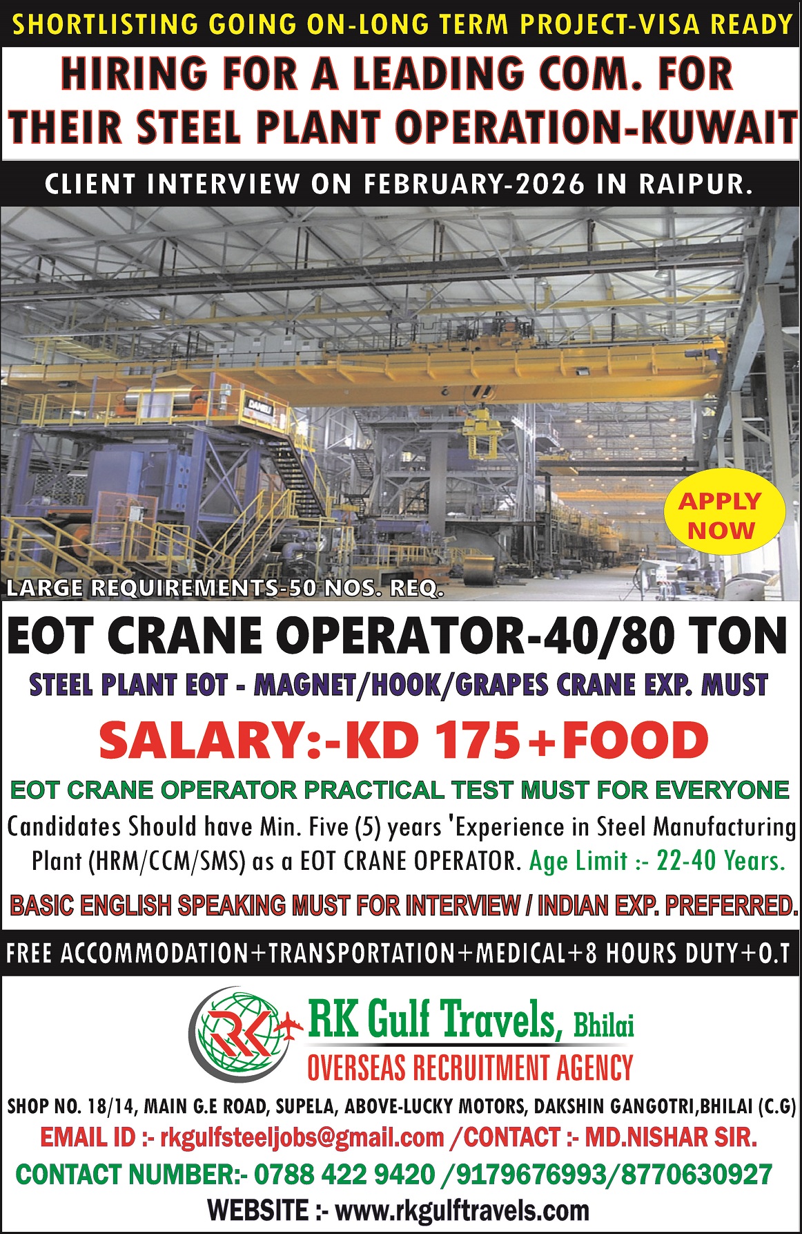 CANDIDATES SHOULD HAVE MINIMUM 4-5 YEARS EXPERIENCE IN STEEL MANUFACTURING CO. /INDIAN EXP. CANDIDATES PREFERRED….Age Limit :- 22 to 40 Years.