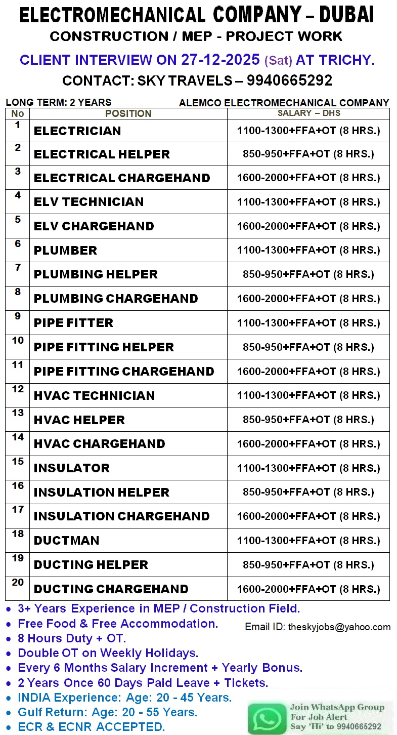 Daily Job Alert Join the Whatsapp Channel Join Now Urgently Required For Leading Company – Dubai. Post navigation Sky Travels, Chennai.