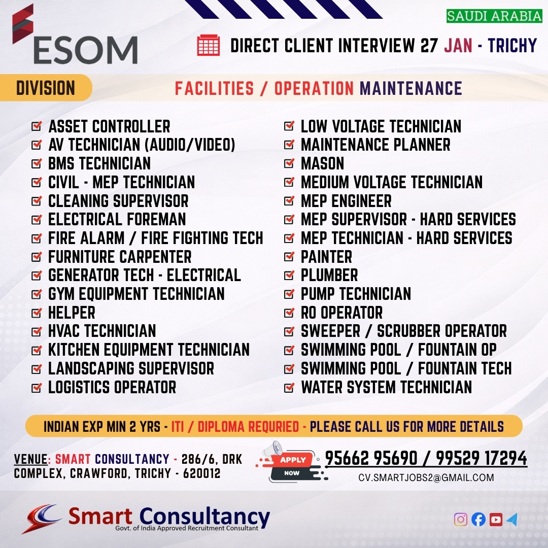 WANTED FOR A LEADING MAINTENANCE COMPANY (SAUDI) DIRECT CLIENT INTERVIEW ON 27 JAN – TRICHY