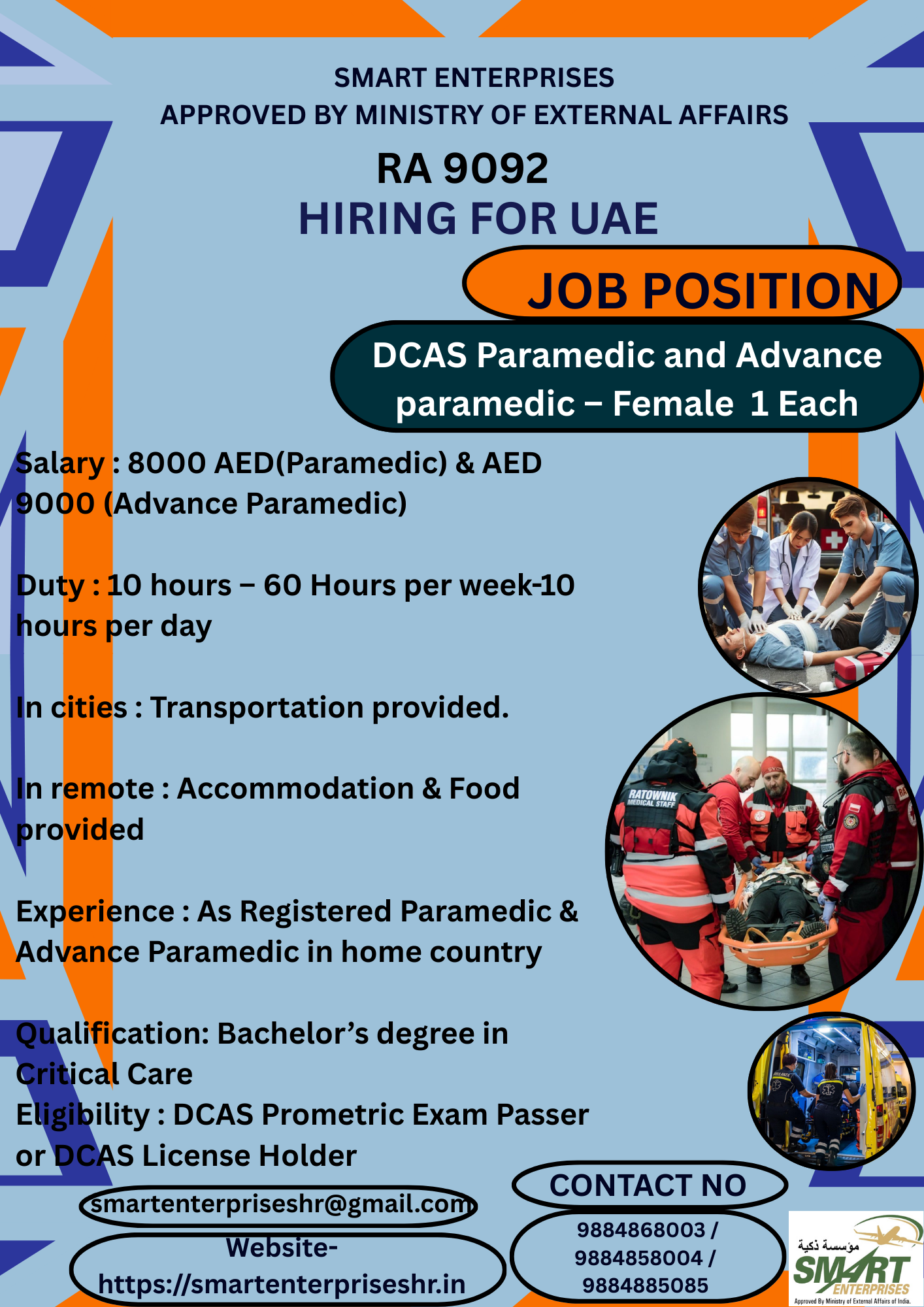 Salary : 8000 AED(Paramedic) & AED 9000 (Advance Paramedic)