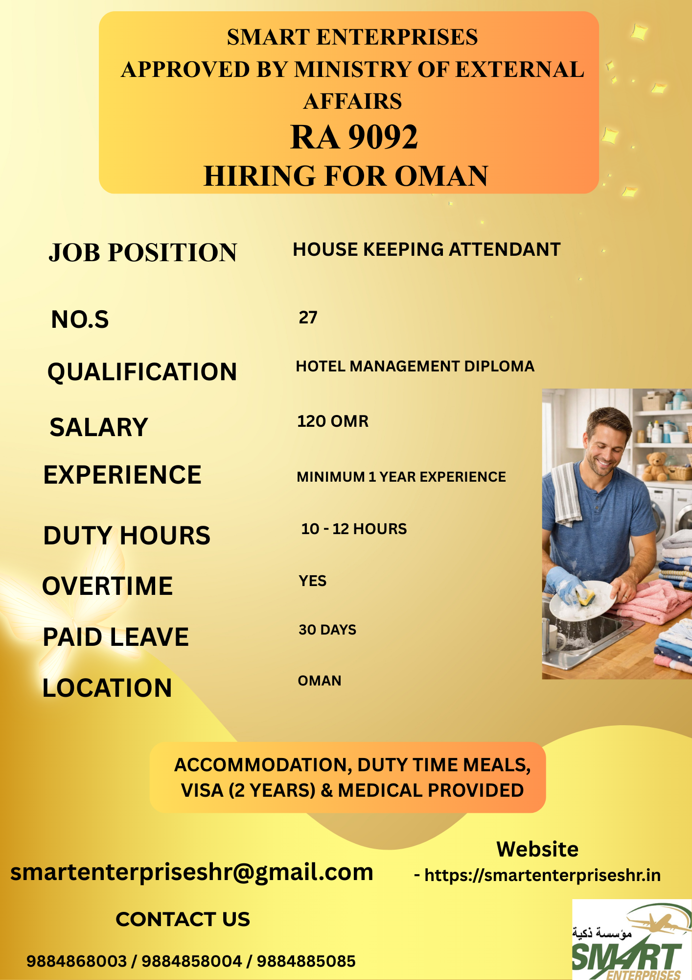 ACCOMMODATION, DUTY TIME MEALS, VISA (2 YEARS) & MEDICAL PROVIDED