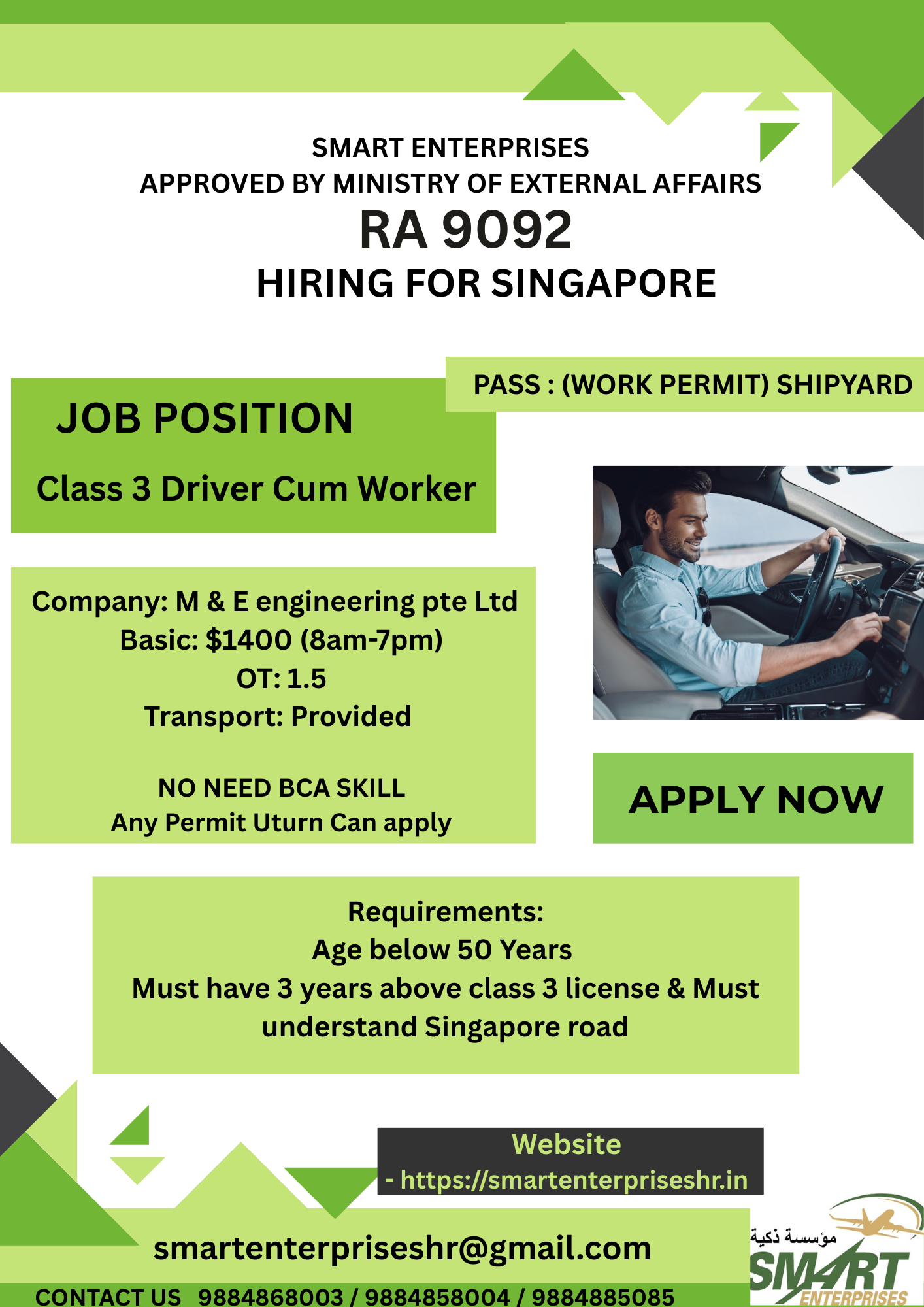 REQUIREMENTS : AGE BELOW 50 YEARS MUST HAVE 3 YEARS ABOVE CLASS 3 LICENSE & MUST UDERSTAND SINGAPORE ROAD
