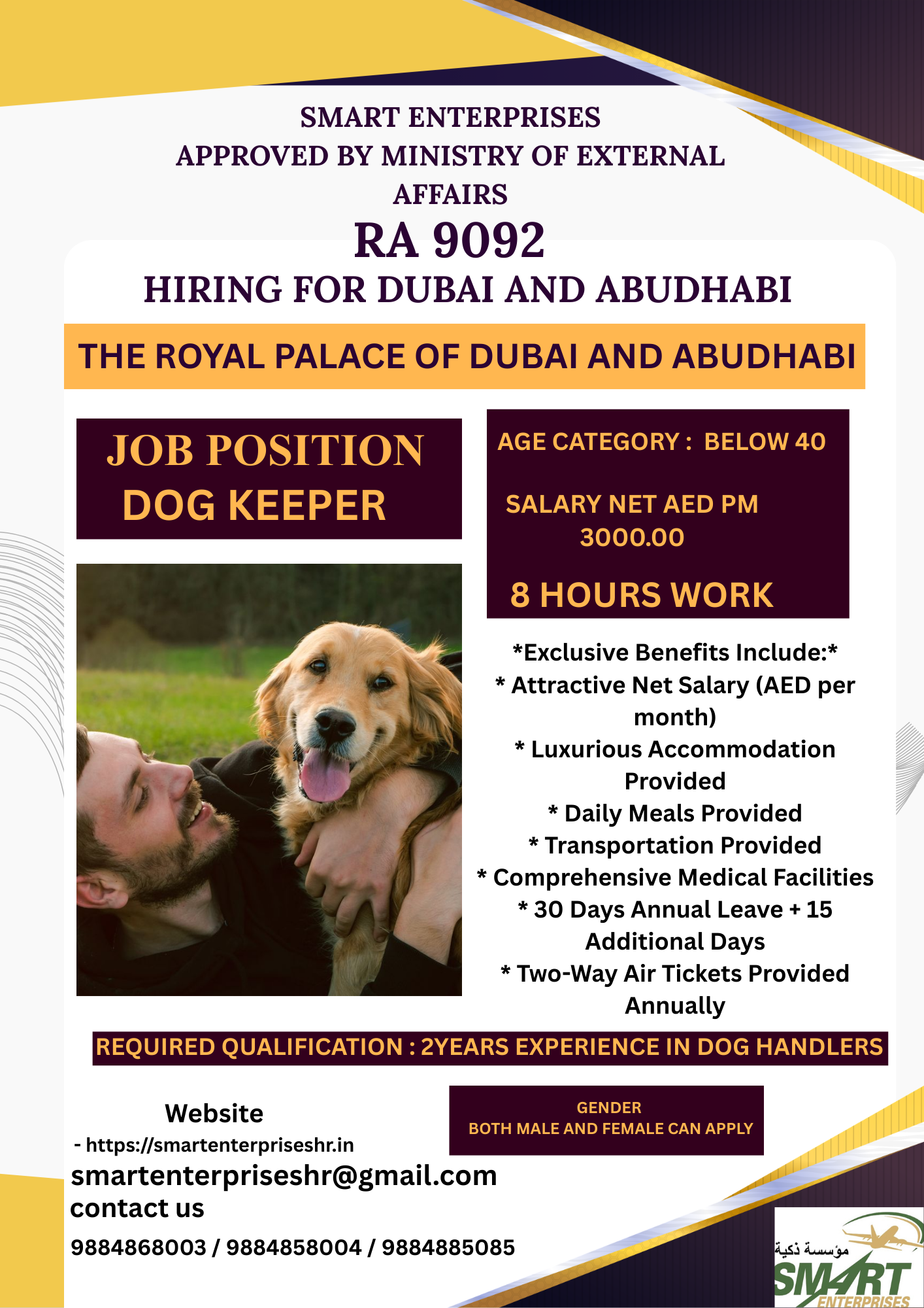 REQUIRED QUALIFICATION : 2YEARS EXPERIENCE IN DOG HANDLERS