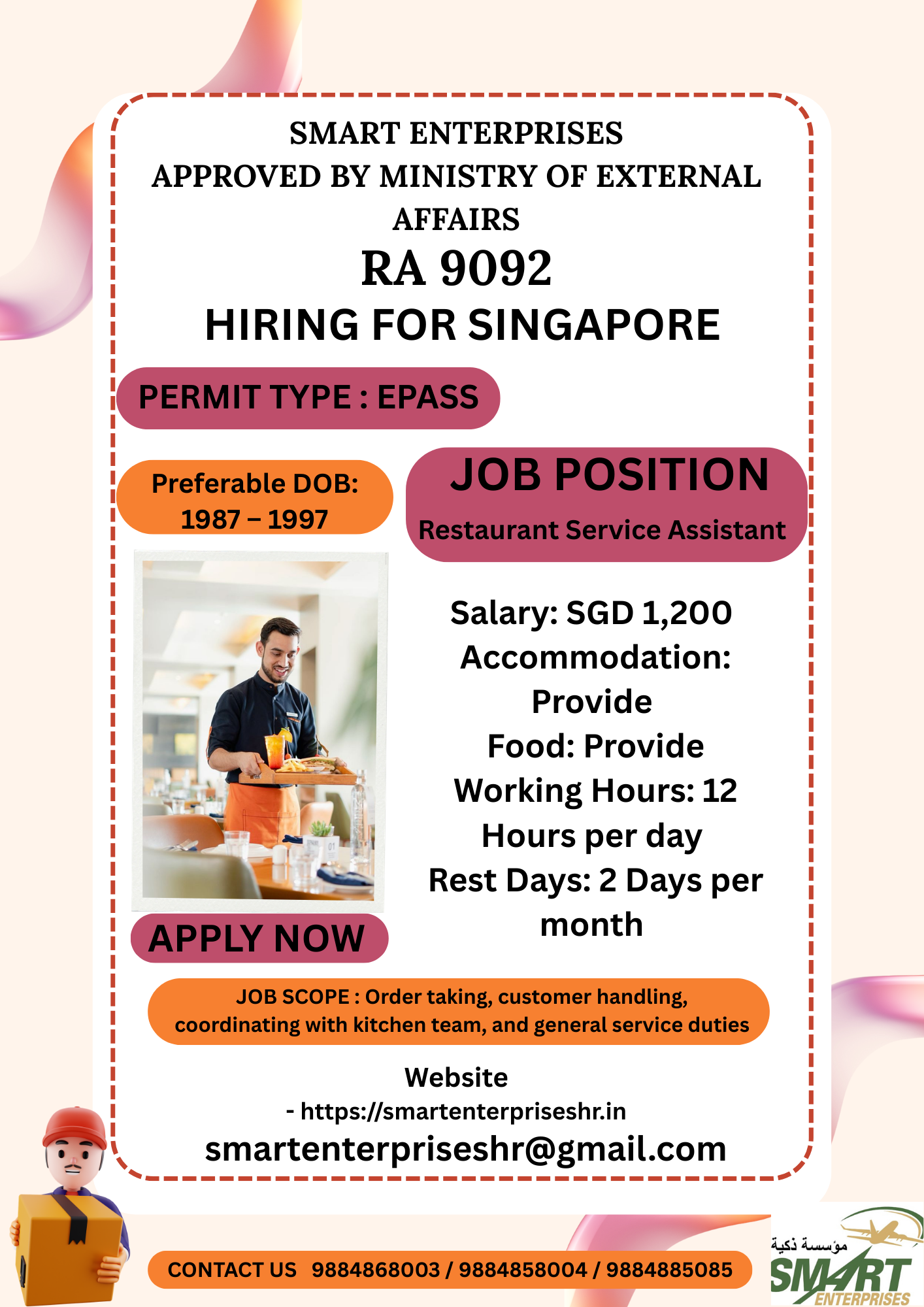 JOB SCOPE : Order taking, customer handling, coordinating with kitchen team, and general service duties