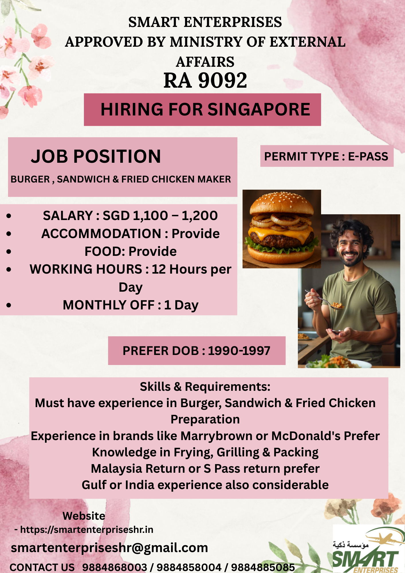 Must have experience in Burger, Sandwich & Fried Chicken Preparation