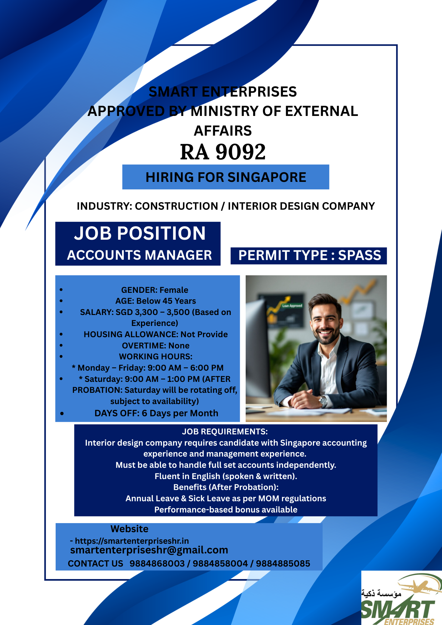Interior design company requires candidate with Singapore accounting experience and management experience.