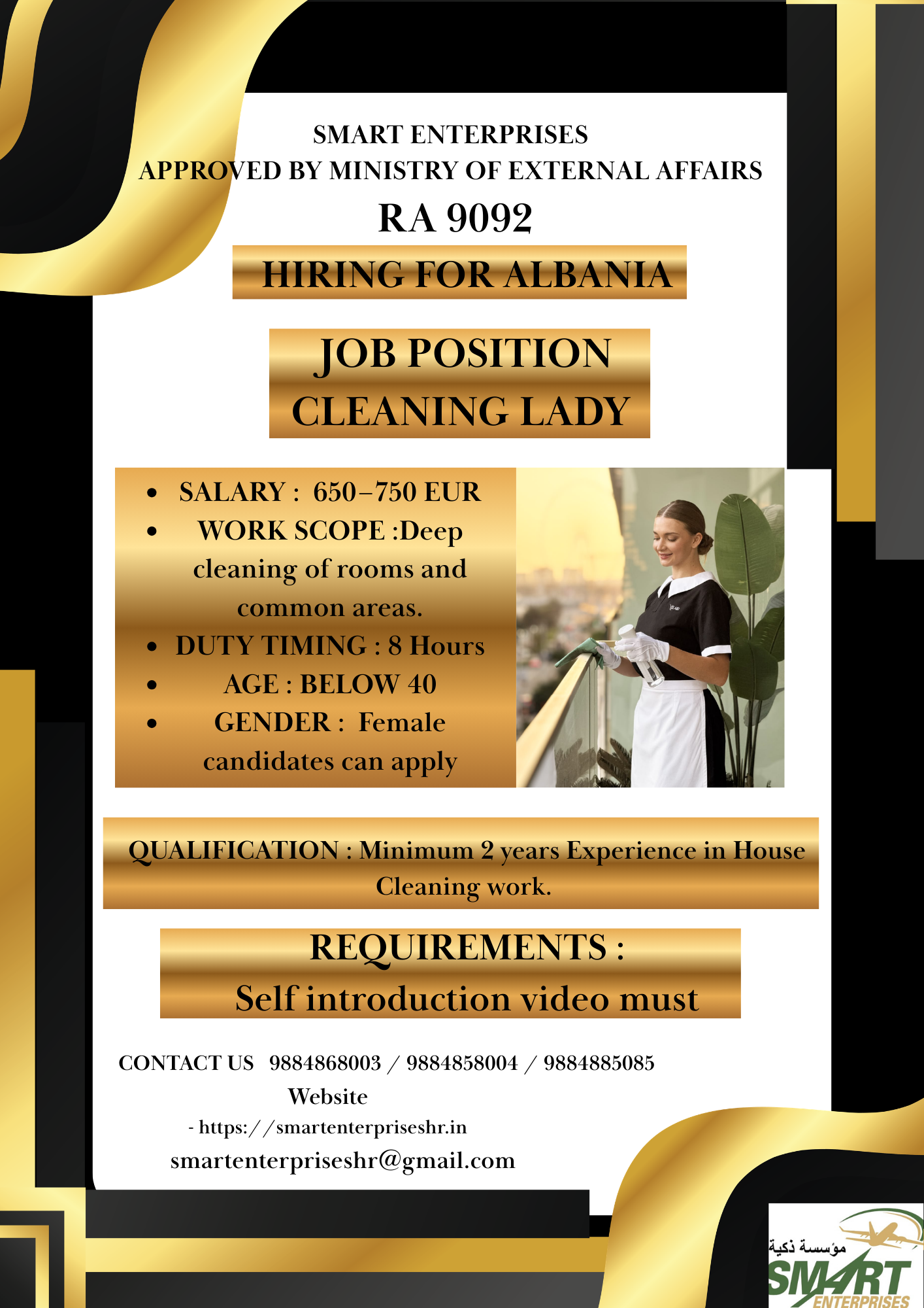 QUALIFICATION : Minimum 2 years Experience in House CLEANING WORK.