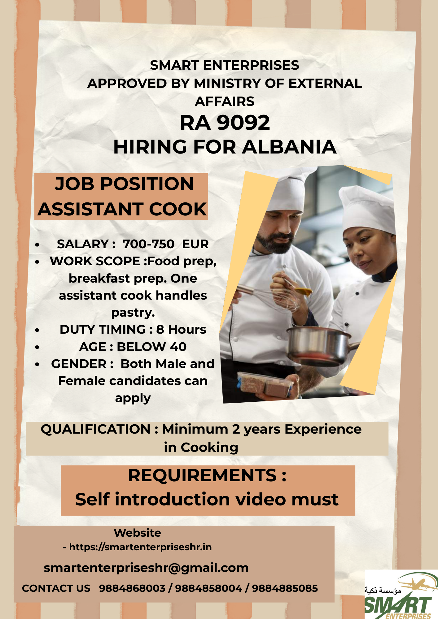 QUALIFICATION : Minimum 2 years Experience in Cooking