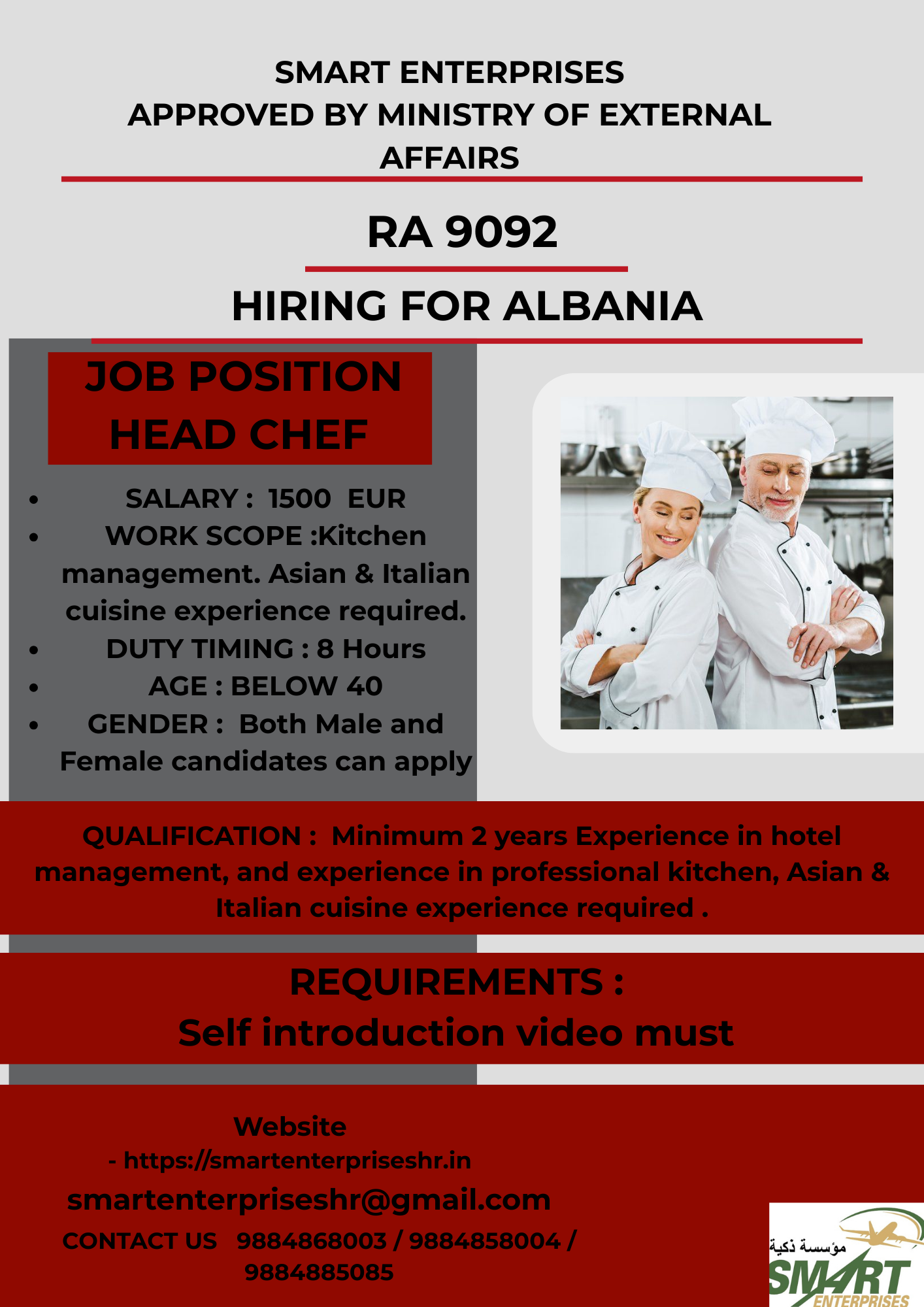QUALIFICATION : Minimum 2 years Experience in hotel management, and experience in professional kitchen, Asian & Italian cuisine experience required .