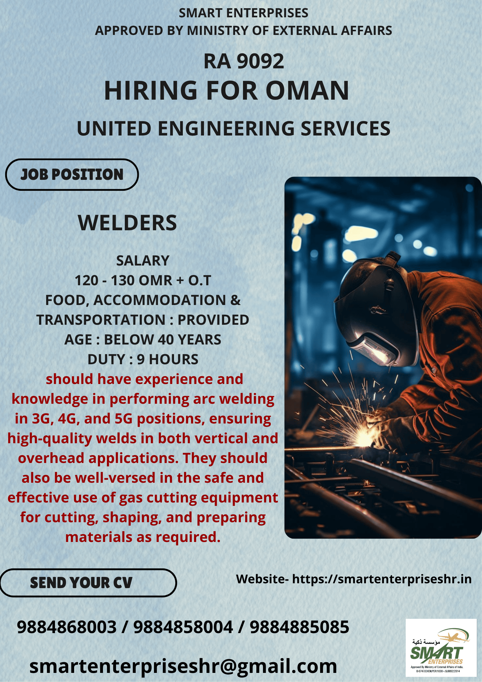should have experience and knowledge in performing arc welding in 3G, 4G, and 5G positions, ensuring high-quality welds in both vertical and overhead applications. They should also be well-versed in the safe and effective use of gas cutting equipment for cutting, shaping, and preparing materials as required.