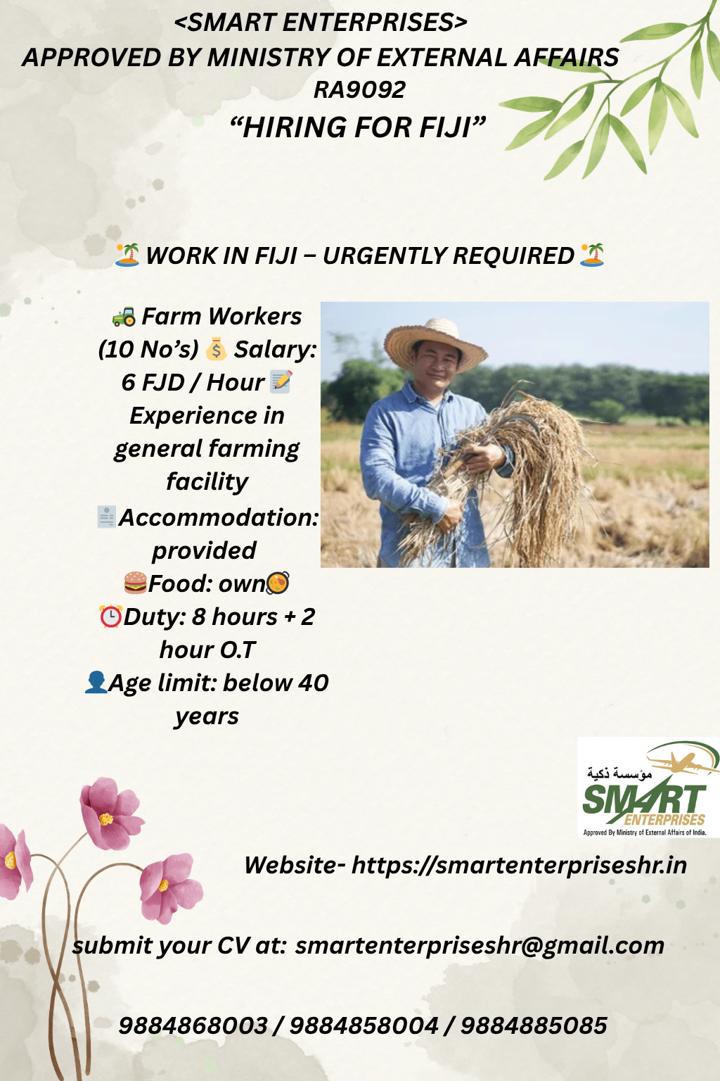 🚜 Farm Workers (10 No’s) 💰 Salary: 6 FJD / Hour 📝 Experience in general farming facility