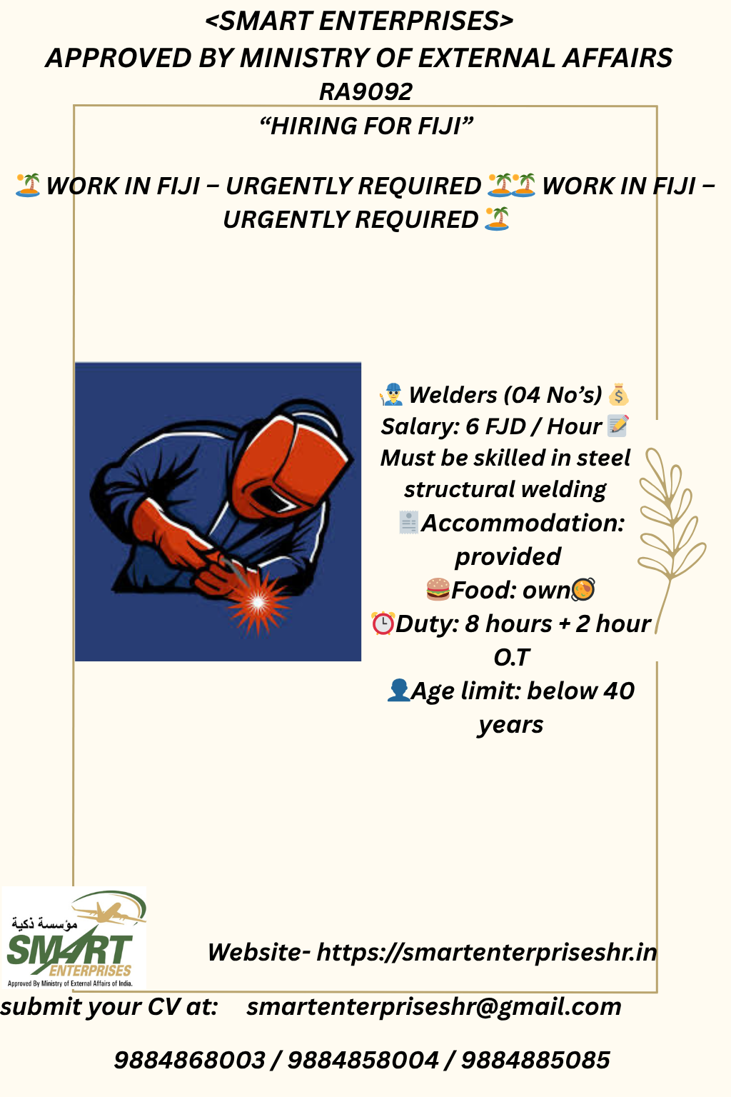 👨🏭 Welders (04 No’s) 💰 Salary: 6 FJD / Hour 📝 Must be skilled in steel structural welding