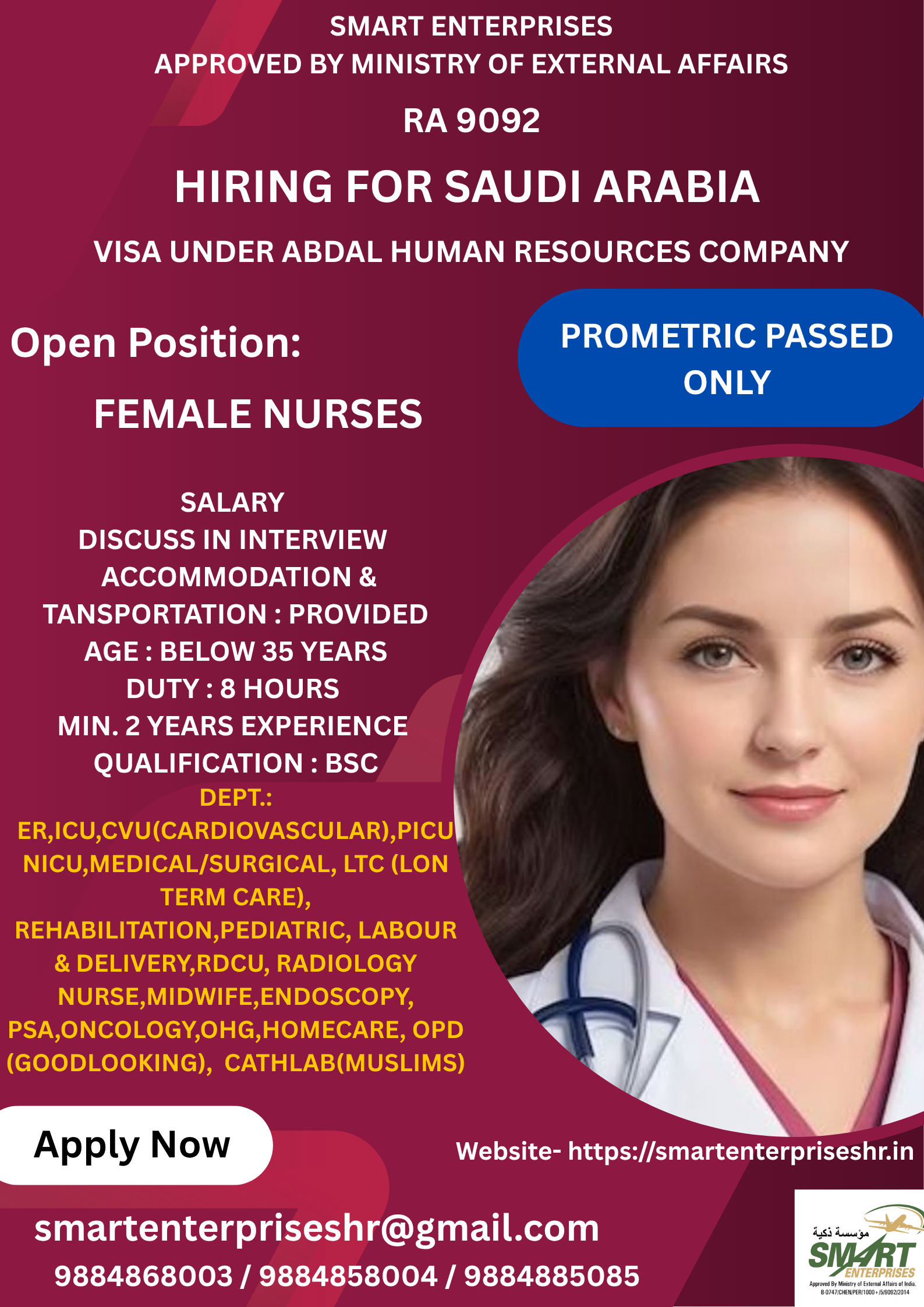 DEPT.: ER,ICU,CVU(CARDIOVASCULAR),PICU NICU,MEDICAL/SURGICAL, LTC (LON TERM CARE), REHABILITATION,PEDIATRIC, LABOUR & DELIVERY,RDCU, RADIOLOGY NURSE,MIDWIFE,ENDOSCOPY, PSA,ONCOLOGY,OHG,HOMECARE, OPD (GOODLOOKING), CATHLAB(MUSLIMS)