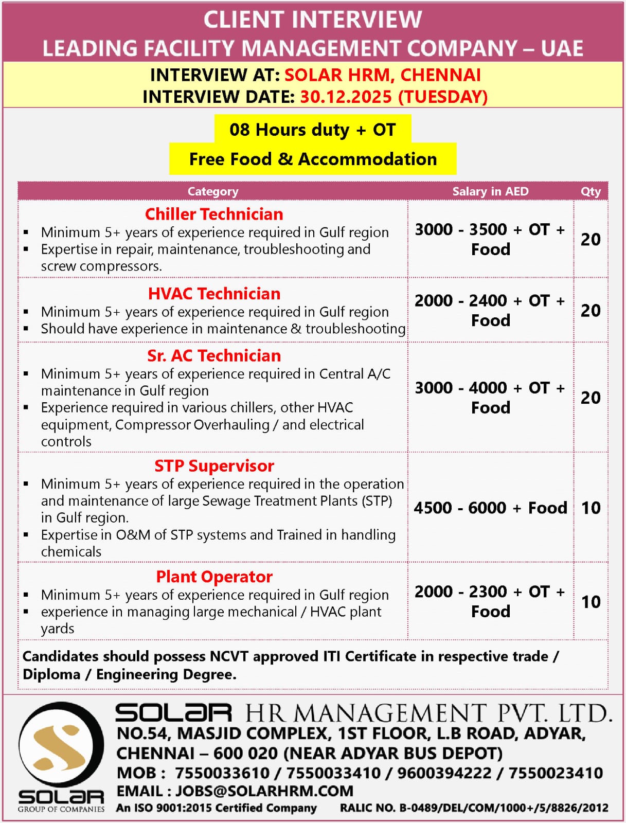 Chiller Technician 3000 – 3500 + OT + Food 20