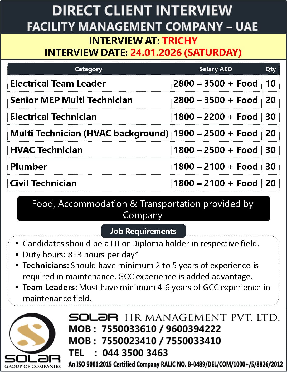 - Technicians: Should have minimum 2 to 5 years of experience is required in maintenance. GCC experience is added advantage.
